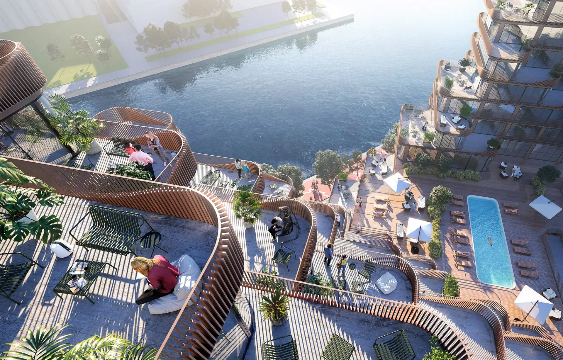 The development’s strategic design maximises waterfront views for each unit, with balconies and terraces extending the living space outdoors. The building’s stepped-back design on higher floors creates spacious terraces, enhancing the connection between indoor and outdoor spaces. This thoughtful design approach ensures that residents can fully appreciate the beauty of their lakeside surroundings.