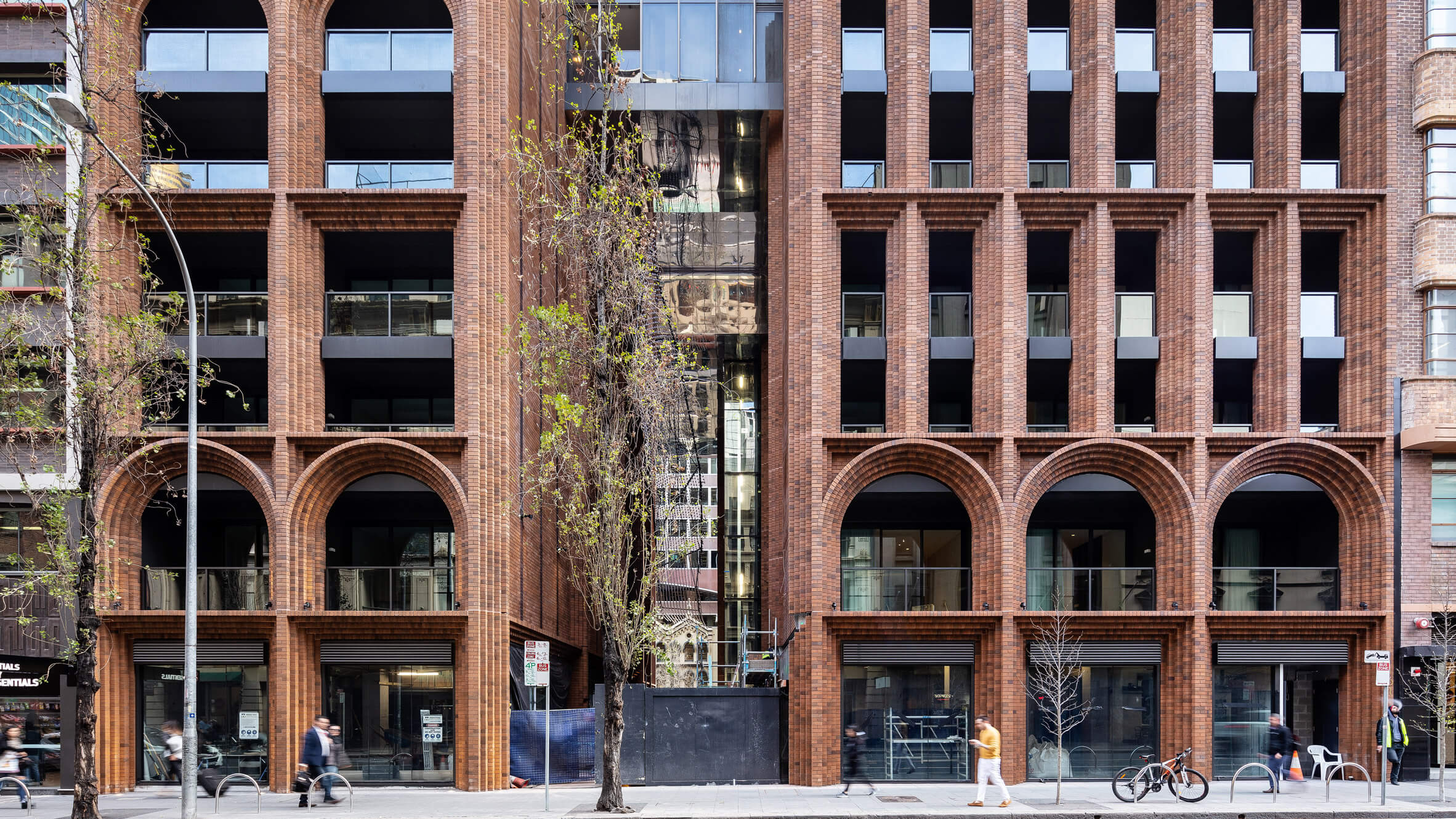 The building’s design pays homage to Sydney’s architectural heritage by incorporating a handcrafted brick podium. Over 300,000 bricks were meticulously laid to create a façade that resonates with the scale and character of neighbouring heritage buildings, such as the Red Cross Building and the Andrew Bros Warehouse. This masonry base grounds the structure in its historical context, while the towers above present a lighter, more contemporary aesthetic.