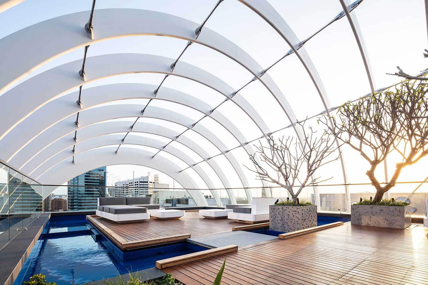 The rooftop of Arc offers communal spaces that encourage social interaction and provide residents and visitors with expansive views of Sydney Harbour and the city. The curved roof arches connect the building with the organic and undulating lines of Sydney Harbour, enhancing the connection between the urban environment and the natural landscape.
