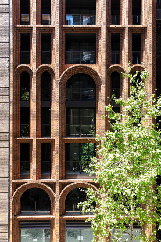 The building’s podium, constructed with over 300,000 hand-laid bricks, aligns with the delicate heritage context of the area. The use of brick arches responds to the scale and character of the adjacent heritage buildings, such as the Red Cross Building and the Andrew Bros Warehouse. The materiality evokes the image of Uluru, with the colour and texture of the brickwork echoing the oxidation of red earth found in the heart of Australia.