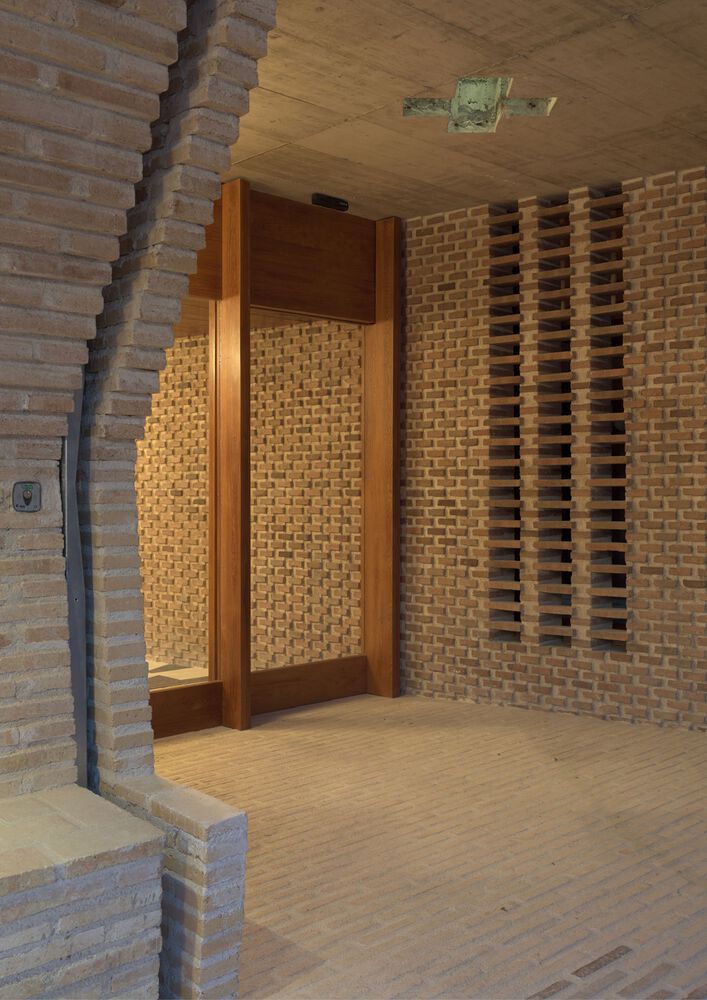 The building’s design is a response to the need for privacy and seclusion, with its opacity shielding the interior from the road. The access route is gradual, inviting calmness, with a porch welcoming visitors in a gesture of hospitality. A long bench allows for rest and fresh air in the shade, and an inclined wall introduces visitors to the nave, accompanying them gently to discover the richness and light of the interior.