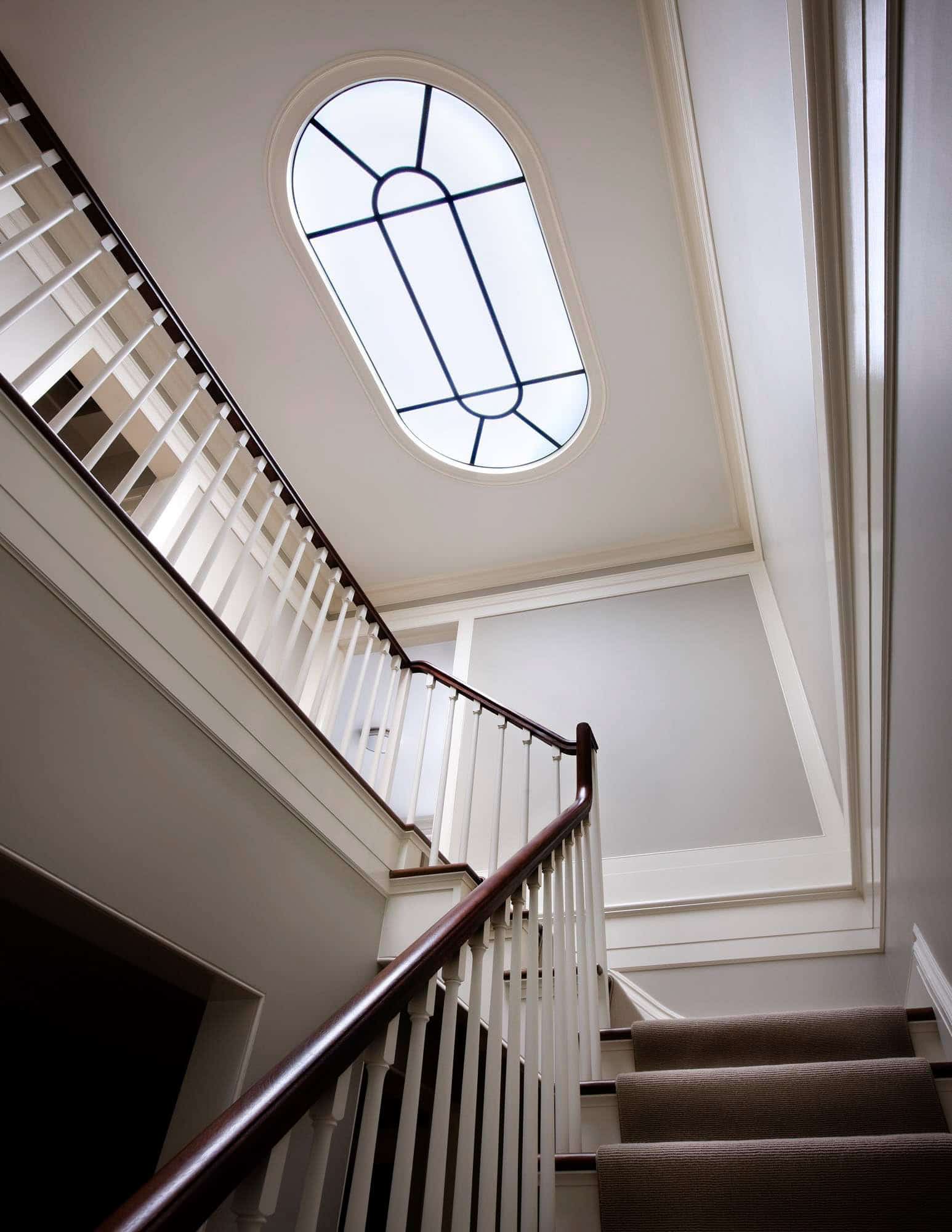 Internally, the layout was reconfigured to create a more open and functional living space. A single-run staircase was relocated to the building’s core, serving as a central axis that connected the various levels. An atypical double-stretch of stairs ascended to a vaulted library on the parlor level, drawing inspiration from James Wyatt’s Heveningham Hall. This design choice added a sense of verticality and grandeur to the interior, enriching the spatial experience.