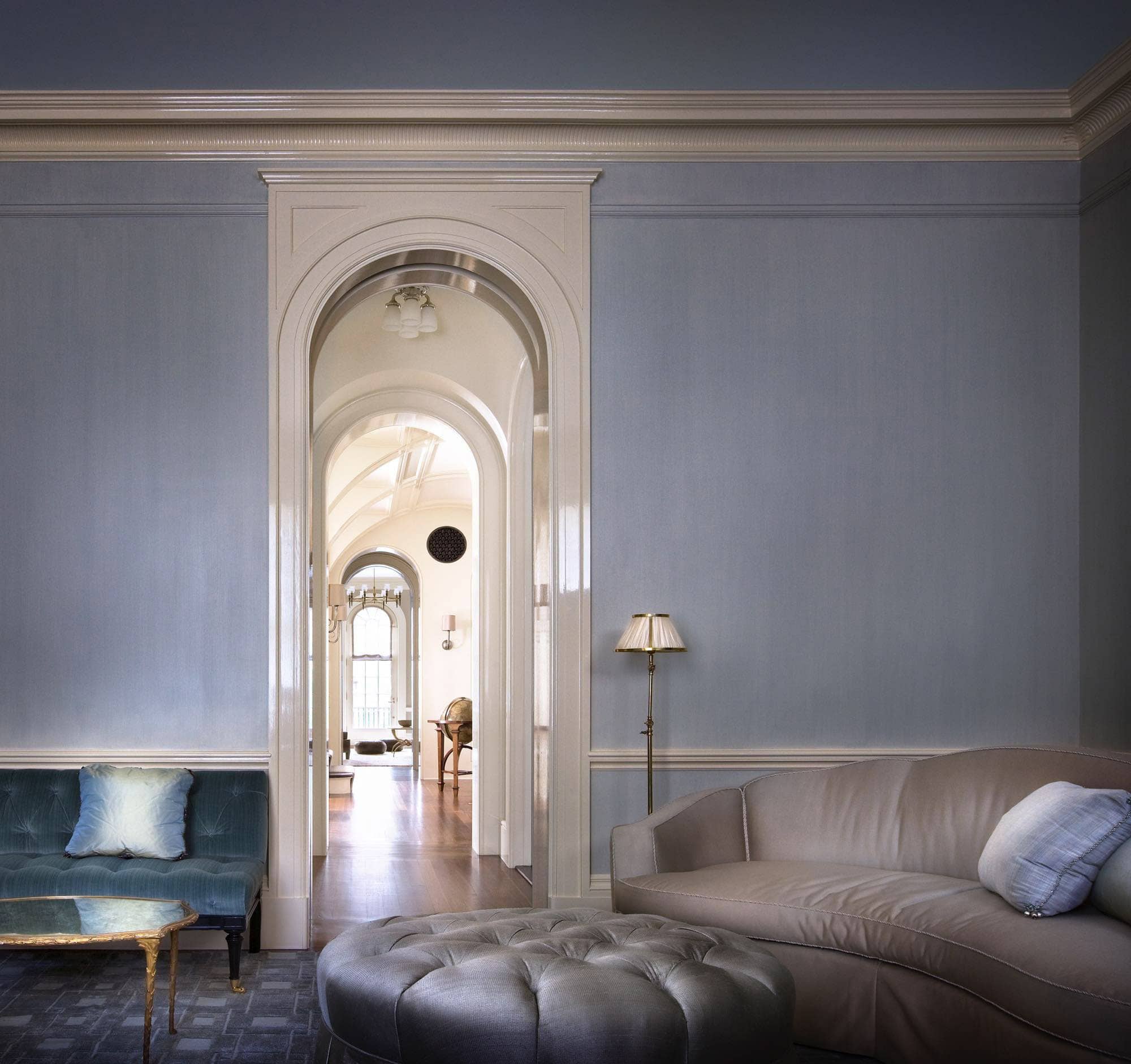 Interior designer Matthew Patrick Smyth was commissioned to decorate the interiors, choosing a colour palette of blues and browns that evoked a sense of warmth and sophistication. This selection complemented the architectural elements and created a cohesive aesthetic throughout the home. The furnishings and finishes were carefully curated to reflect both the building’s history and the clients’ contemporary lifestyle, resulting in a space that was both timeless and functional.