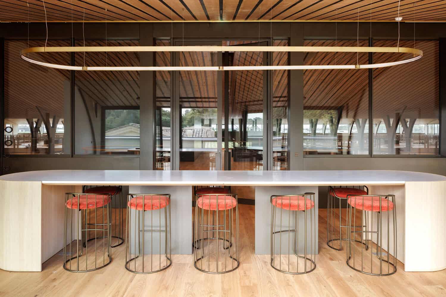 The tasting room and shop were redesigned to open onto a terrace with views of the château, enhancing the visitor experience. A comprehensive landscape project was implemented to connect the various buildings of the estate through new pathways between the trees, creating a cohesive and inviting environment. This landscape integration ensures that the winery’s operations and visitor areas are seamlessly connected, reflecting the estate’s commitment to both functionality and aesthetics.
