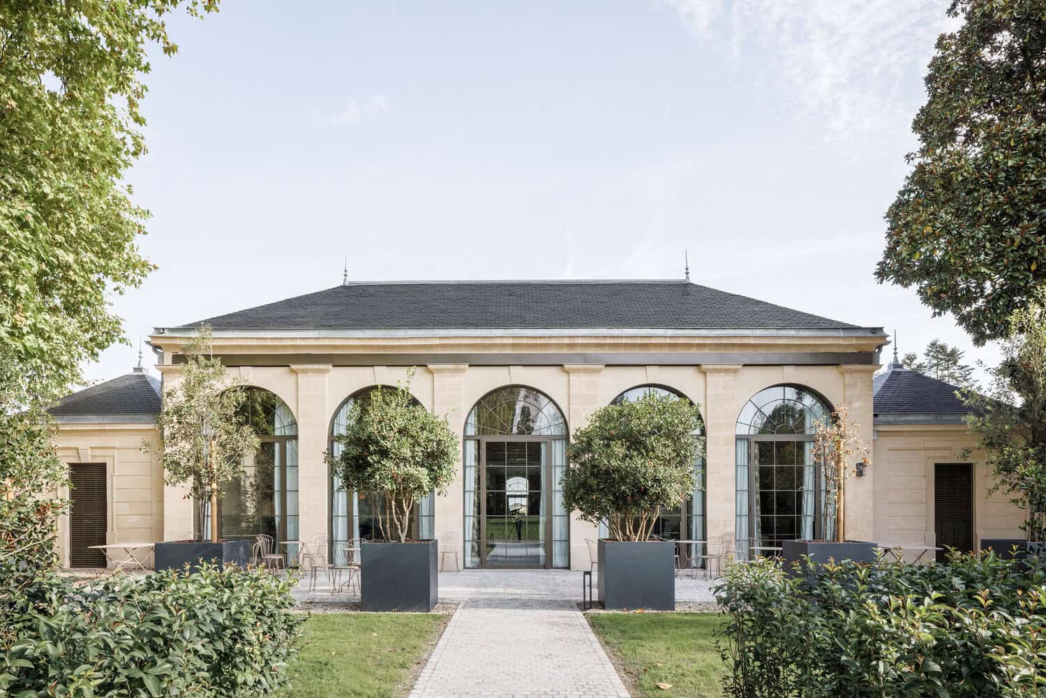 The restoration focused on the historic château, meticulously preserving its stone façades and woodwork to maintain its classical aesthetic. The interior was reimagined to accommodate nine bedrooms, living rooms, dining areas, and reception spaces, offering a blend of elegance and comfort. Adjacent to the château, the orangery was expanded and redesigned into a versatile seminar space, capable of hosting approximately fifty people. This extension seamlessly integrates with the existing architecture, ensuring continuity and respect for the site’s historical context.