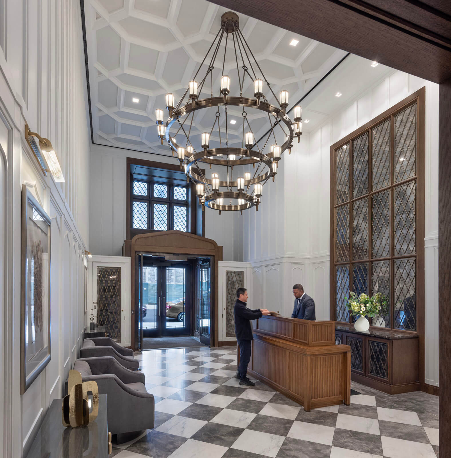 The interior spaces of Claremont Hall are equally impressive. The lobby, designed in collaboration with CetraRuddy Architects, merges Old World influences with a fresh sensibility. The curated mix of amenities includes a walnut-paneled library, a grand dining room, a children’s playroom, a creative maker’s room, a resident lounge with a terrace, a fitness centre, and an indoor pool. The pool, originally the refectory for seminary students and faculty, features soaring Gothic ceilings, original chandeliers, and exposed beams, providing a serene retreat for residents year-round.