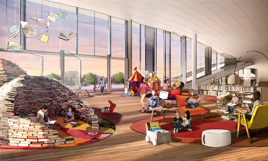 Internally, the library is designed to accommodate a diverse range of activities and programs. Over its five storeys, the building will house working and reading spaces, play areas, a makers’ lab, a teaching kitchen, and a café. These facilities are intended to support educational and cultural programs, catering to the varied interests and needs of the community. The inclusion of a makers’ lab and teaching kitchen underscores the library’s commitment to hands-on learning and skill development.