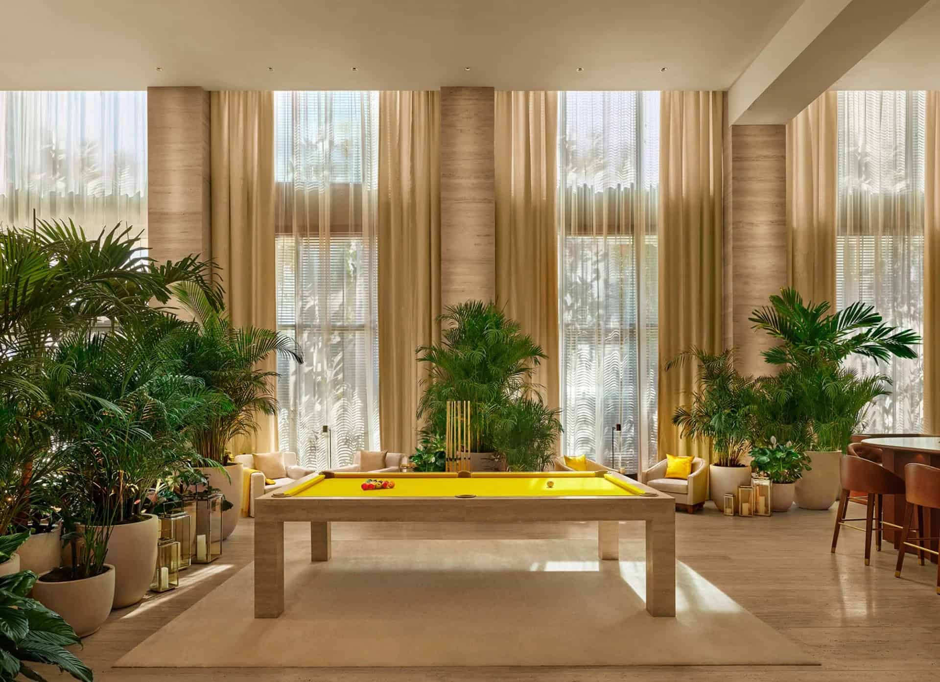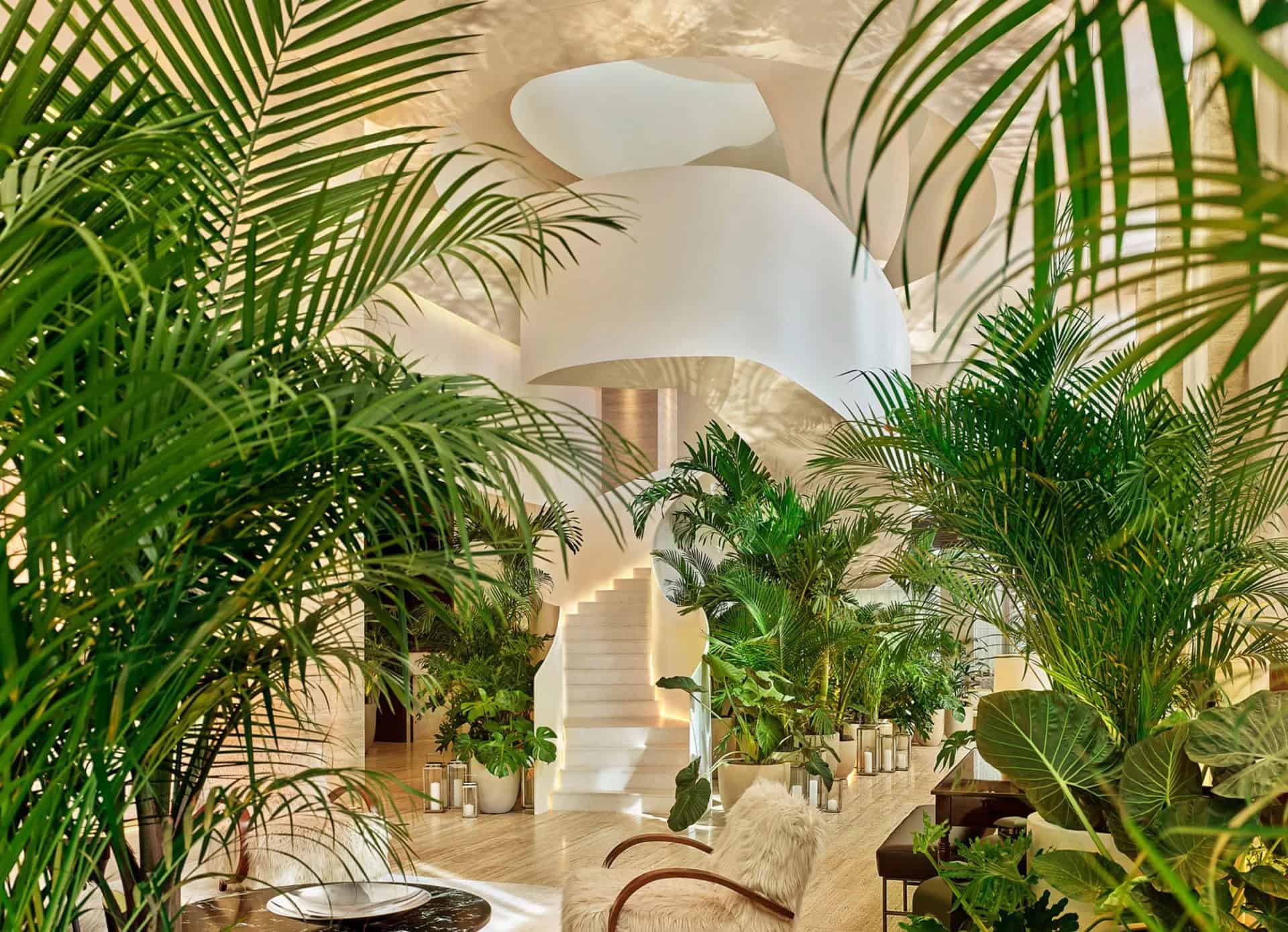 The hotel’s interior spaces are thoughtfully curated to enhance the guest experience. Bonetti/Kozerski Architecture, in collaboration with Ian Schrager, designed the furniture for the public areas, contributing to the hotel’s distinctive aesthetic. The lobby features a striking marble staircase, serving as a focal point that guides guests through the expansive space. Lush greenery is strategically incorporated, creating a ‘jungle’ ambiance that complements the hotel’s modern design elements.