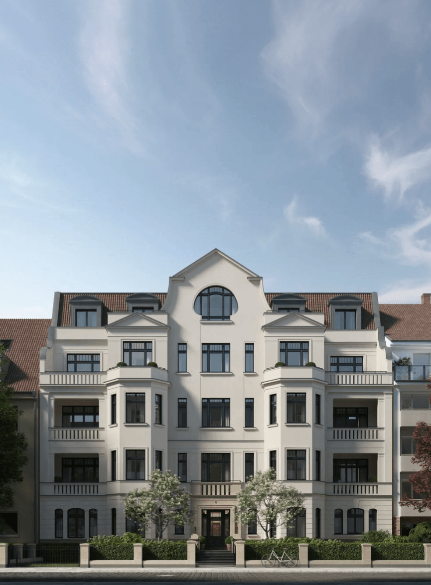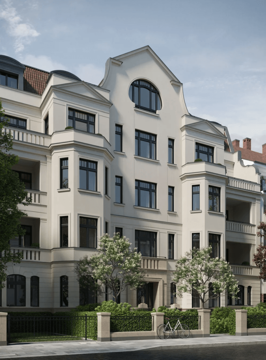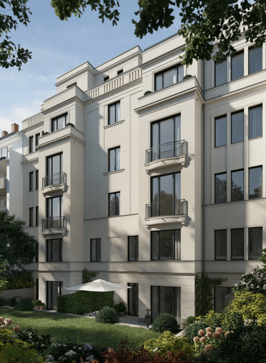 The interior design follows a restrained, classical aesthetic, with herringbone parquet flooring in oiled oak, profiled skirting boards, elegant wall colours in soft grey tones, and premium fittings from Villeroy & Boch and Dornbracht. Bathrooms are clad in natural stone, and bespoke built-in furnishings are included. Technical features such as intruder alarm systems, an air-to-water heat pump, and a photovoltaic system on the extensively greened roof seamlessly unite aesthetics with sustainability. The building’s location in the Zooviertel district offers a tranquil environment with wide pavements and mature trees, combining a sense of calm with the vibrancy of urban living. The nearby Zoopark serves as a green oasis, while the adjacent Flingern district, with its cafés, galleries, and shops, attracts a younger creative crowd. Public transport connections are excellent, and daily essentials are within easy walking distance, blending quality of life with infrastructural strength. Goethestraße 8 unites premium location, architectural distinction, and constructional excellence, offering a residence that is enduring in value, representative in character, and designed with future generations in mind.