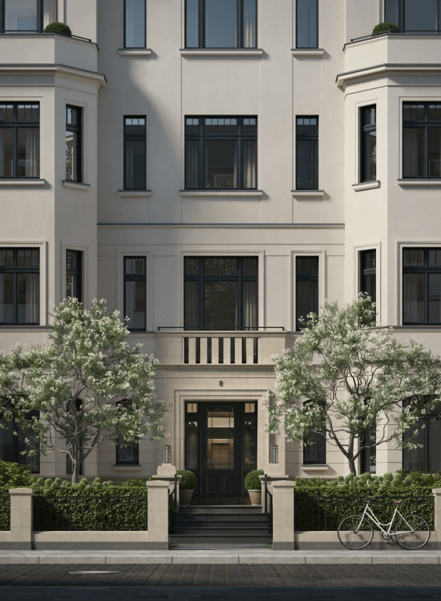 Goethestraße 8, located in Düsseldorf’s Zooviertel district, is an apartment building designed by Sebastian Treese Architekten. The project comprises nine exclusive residences, including two maisonettes with private gardens and a penthouse. The building’s design features a magnolia-white plaster façade with classical detailing, bay windows, loggias, and a balustraded eaves, reflecting the architectural style of Düsseldorf’s Carlstadt and the surrounding bourgeois residences. The base is constructed from Grauwacke and limestone, anchoring the structure in its regional context. The two small gabled pavilions and the ornamental main gable elevate the building, providing expansive rooftop terraces with panoramic city views.