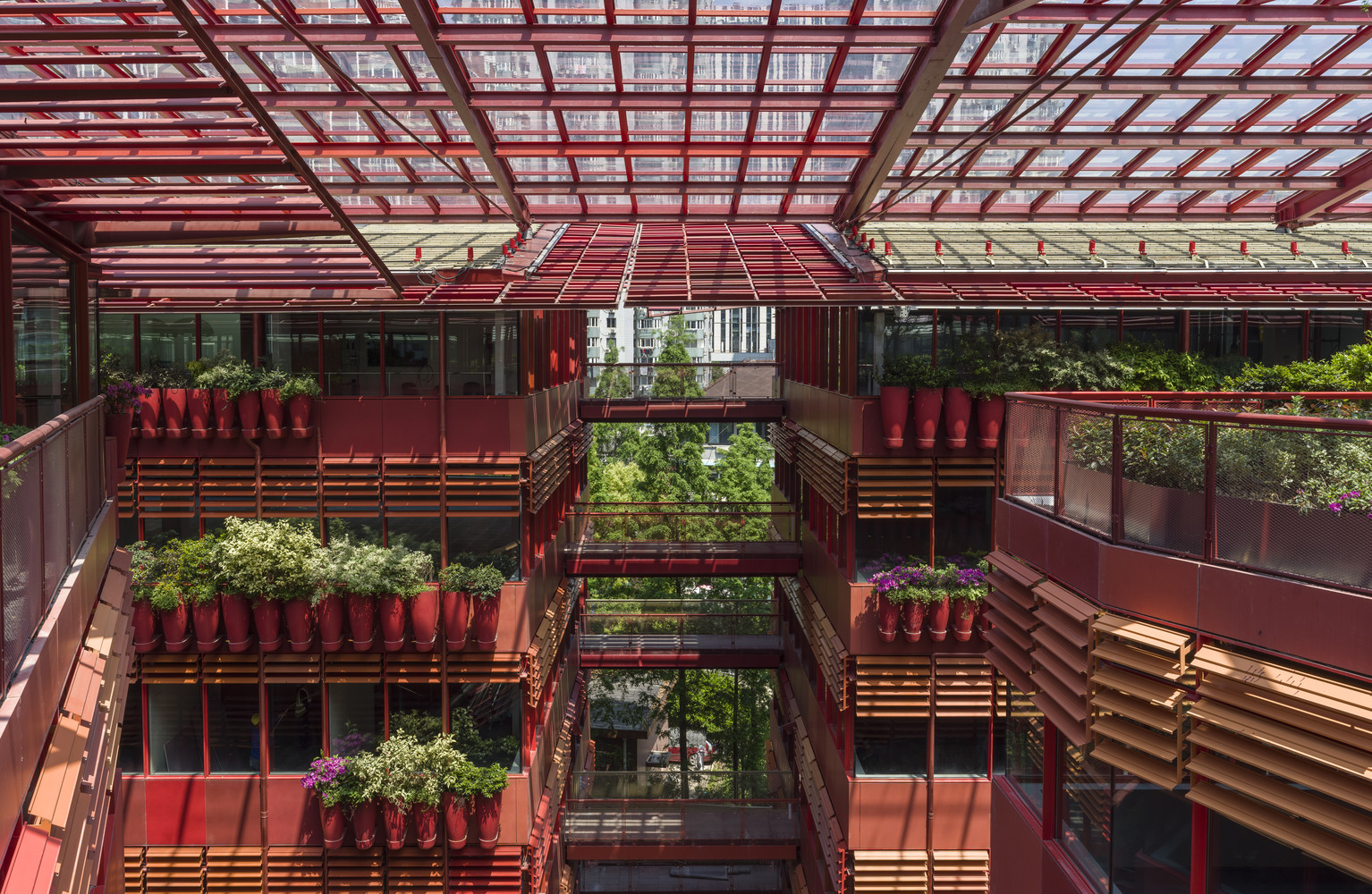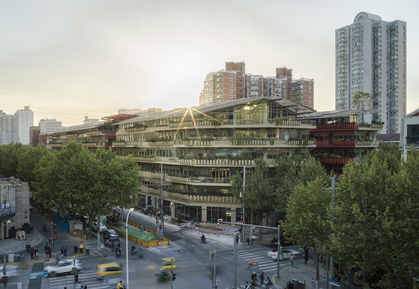 The interplay between retail spaces, office areas, and rooftop restaurants fosters a lively and animated environment. Adjustable slats on the building’s facades create dynamic shadow patterns, adding depth and intrigue to the streetscape.