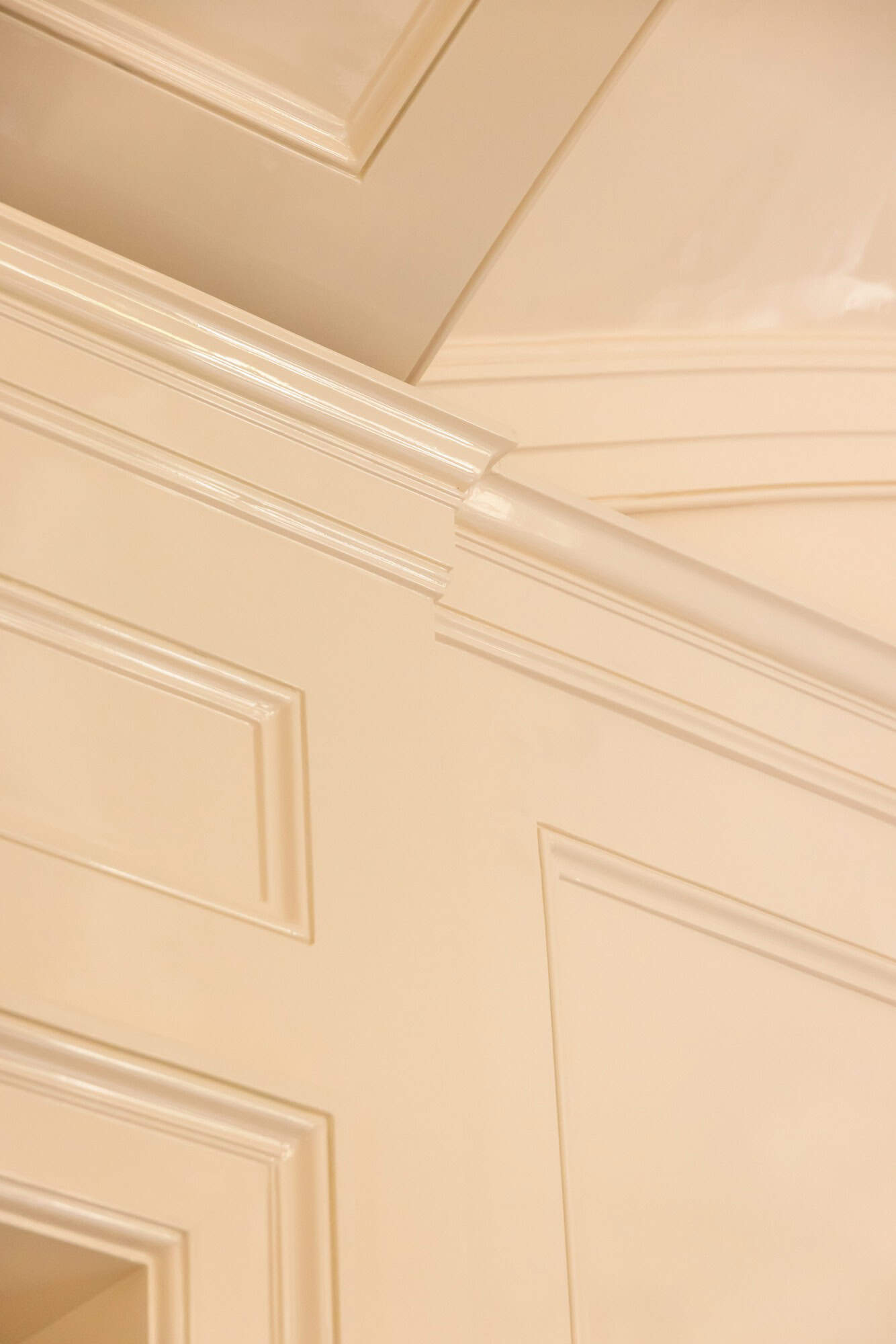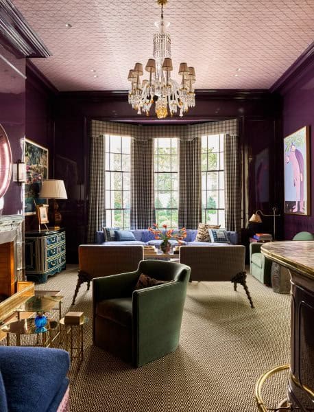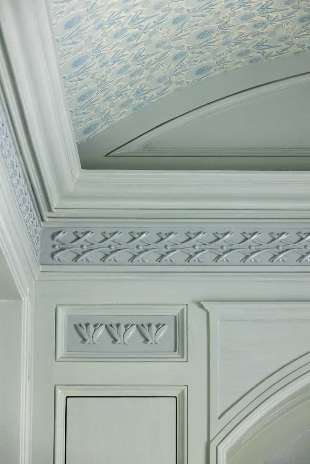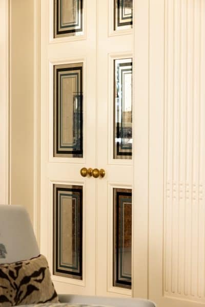 Proceeding through the verre églomisé doors by artist Miriam Ellner, one enters the three entertaining rooms—the lounge, living room, and dining room. These spaces are connected by antique, carved pocket doors that are original to the house, preserving the home’s historical integrity. Each room was given a distinct architectural language, yet a nuanced and subtle exchange of design elements was maintained across the spaces. The restraint of fluted plaster mingled with classical geometry and Chinoiserie influences, embodying the exoticism and glamour characteristic of the Hollywood Regency style. This thoughtful integration ensured that the home’s historical essence was honoured while introducing contemporary comforts.