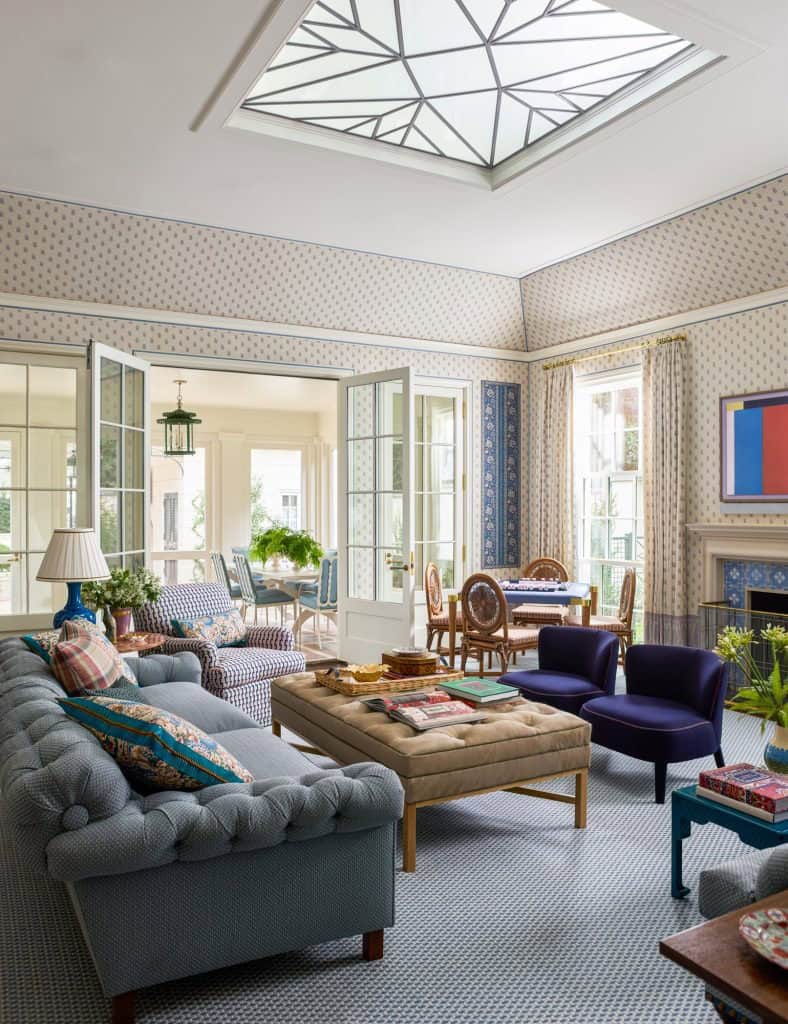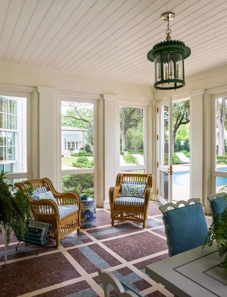 The architectural intervention focused on enhancing the home’s spatial organisation and connectivity. A new symmetrical wing was introduced to the existing L-shaped structure, effectively opening the kitchen to the family room. This strategic relocation of the family room from the formal centre to a more intimate setting at the end of the house created a harmonious flow between spaces. Adjacent to the family room, a screened porch with a plaid-patterned terrazzo floor was added, establishing a seamless indoor-outdoor connection between the main house and the pool cabana. These thoughtful additions not only improved the home’s functionality but also preserved its original spatial economy.