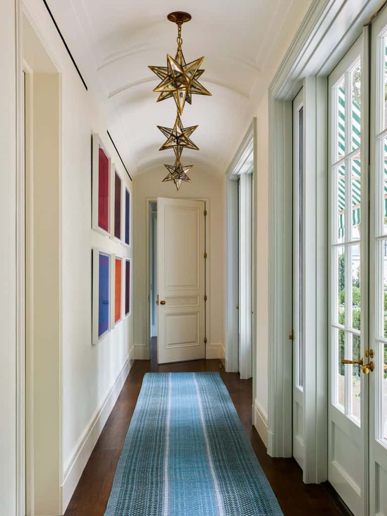 The renovation also addressed the home’s circulation, transforming the previously endless corridors into rhythmic enfilades of vestibules and rooms. This reorganisation enhanced the overall spatial experience, making the home more cohesive and accessible. The design team, in collaboration with interior designers Avrea & Company, meticulously incorporated Hollywood Regency motifs throughout the interior. In the entry hall, intersecting groin-vaulted ceilings, strapping, and panelised systems were employed to rationalise the space and align the central axis. The geometric pattern of the marble floors further reinforced this design intent, creating a sense of order and elegance.
