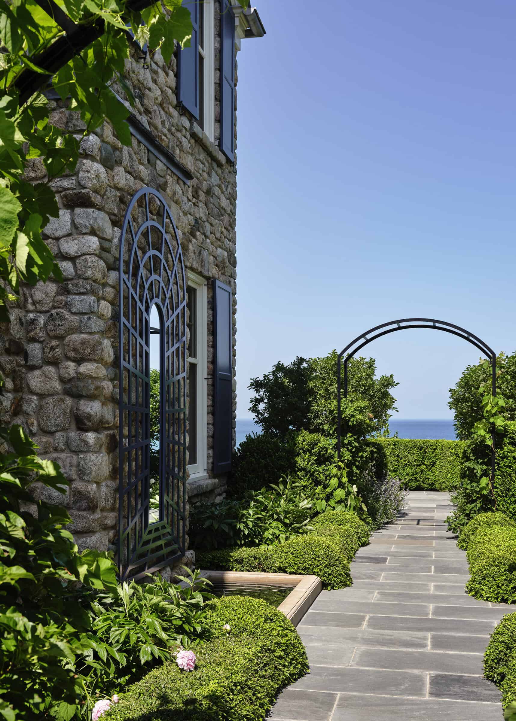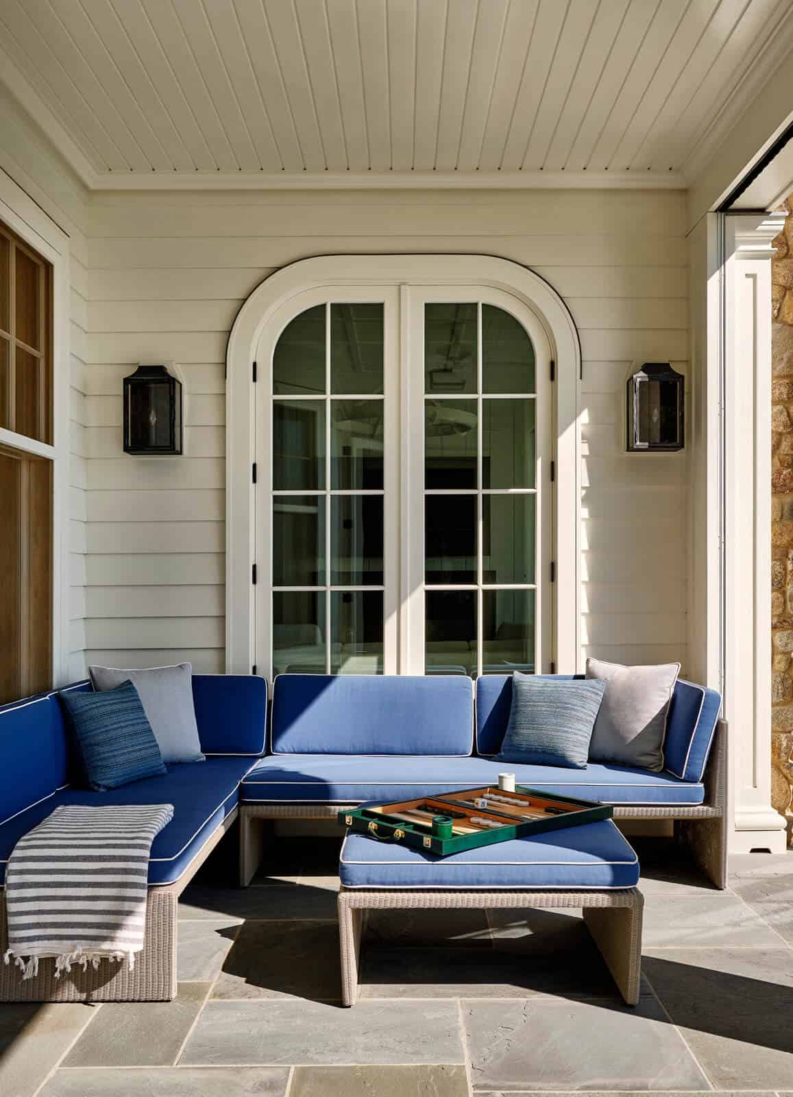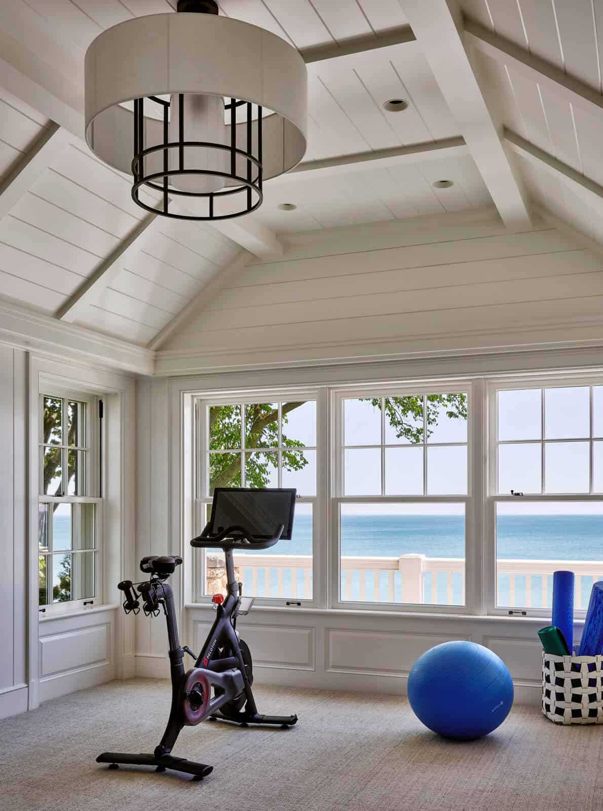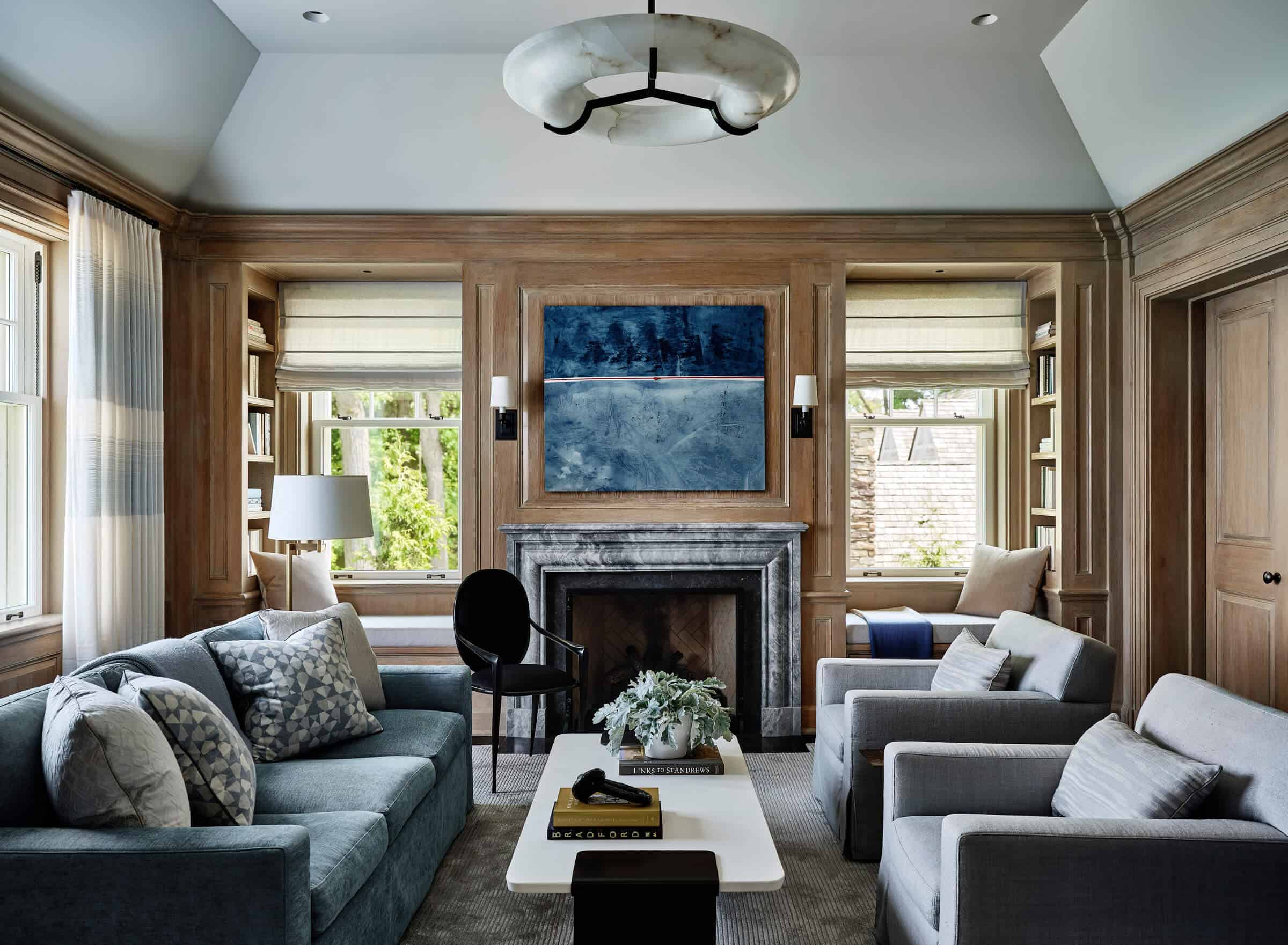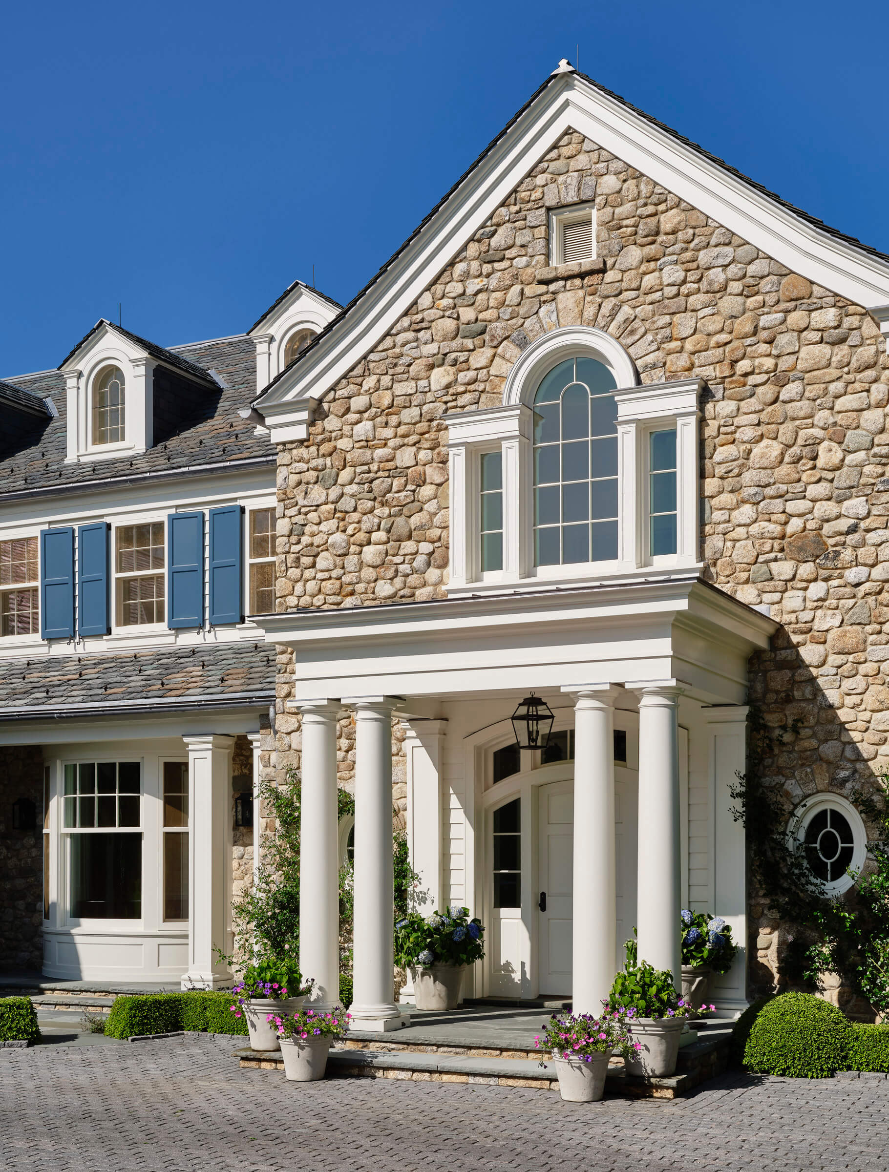 The exterior of the house showcases an American-Georgian style, featuring a harmonious blend of New England fieldstone, white clapboard, and blue shutters. This combination not only pays homage to classic architectural elements but also complements the surrounding landscape. The design incorporates asymmetric gables, porches, and bay windows, adding depth and character to the facades facing both the street and Lake Michigan.