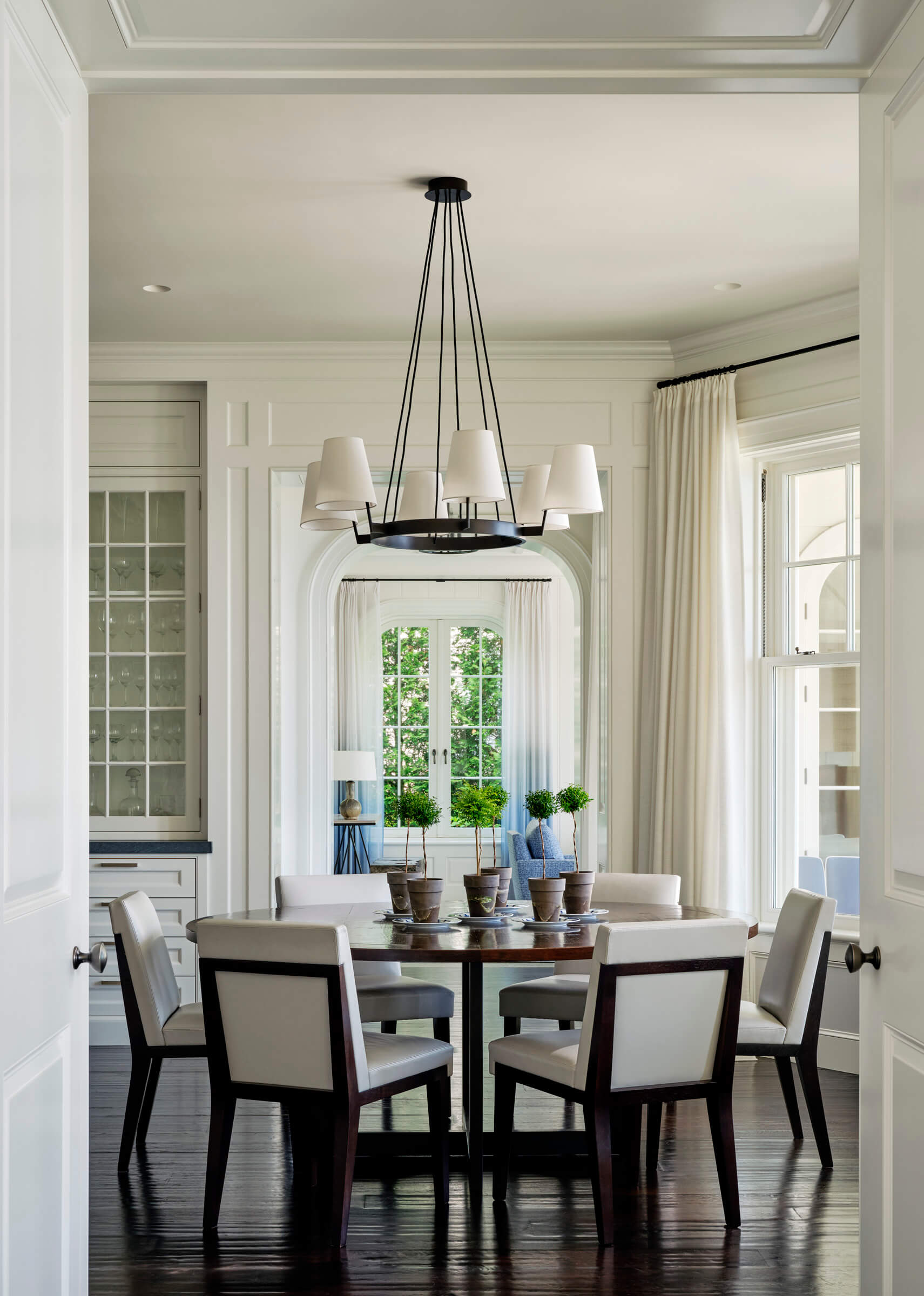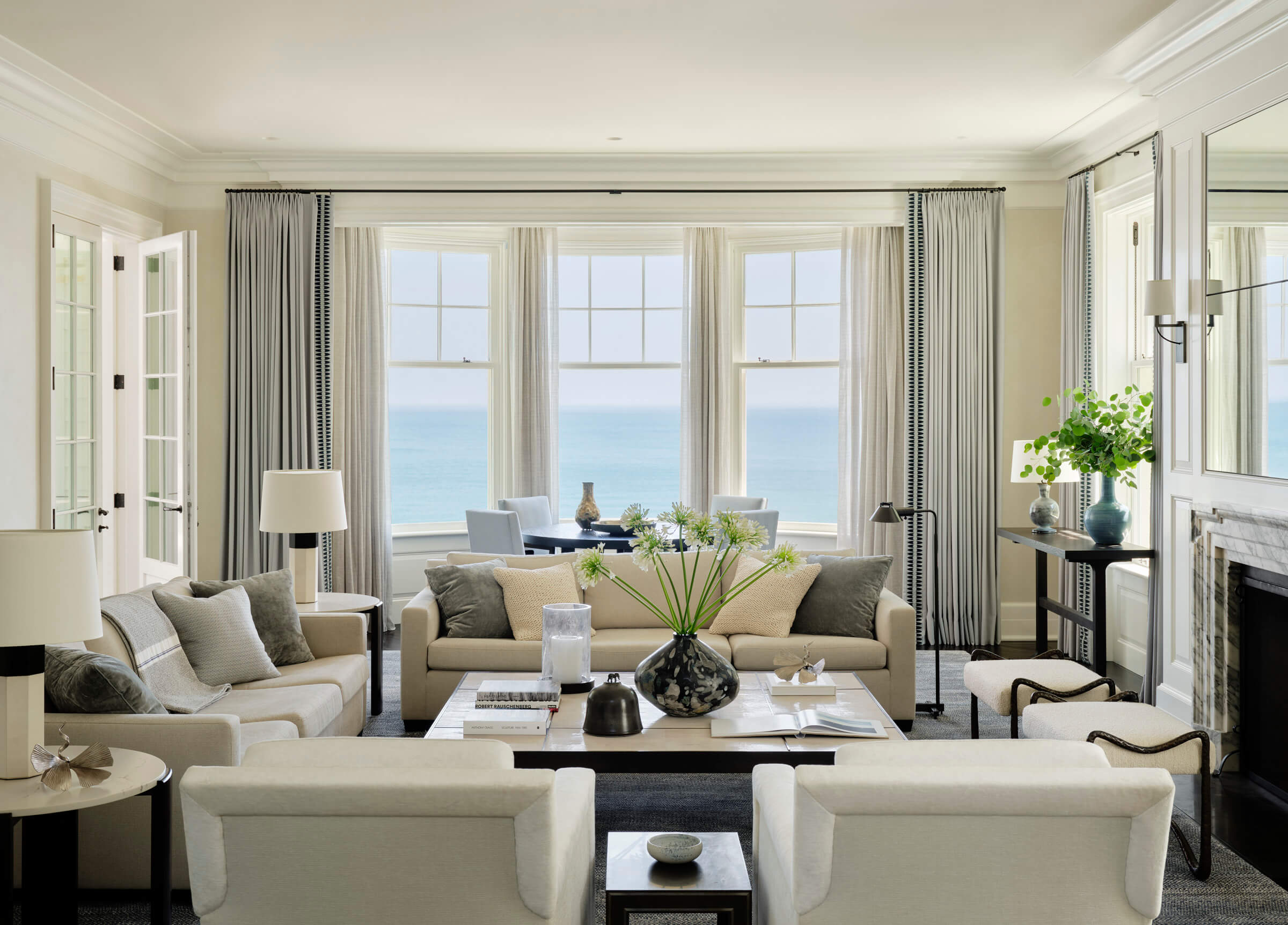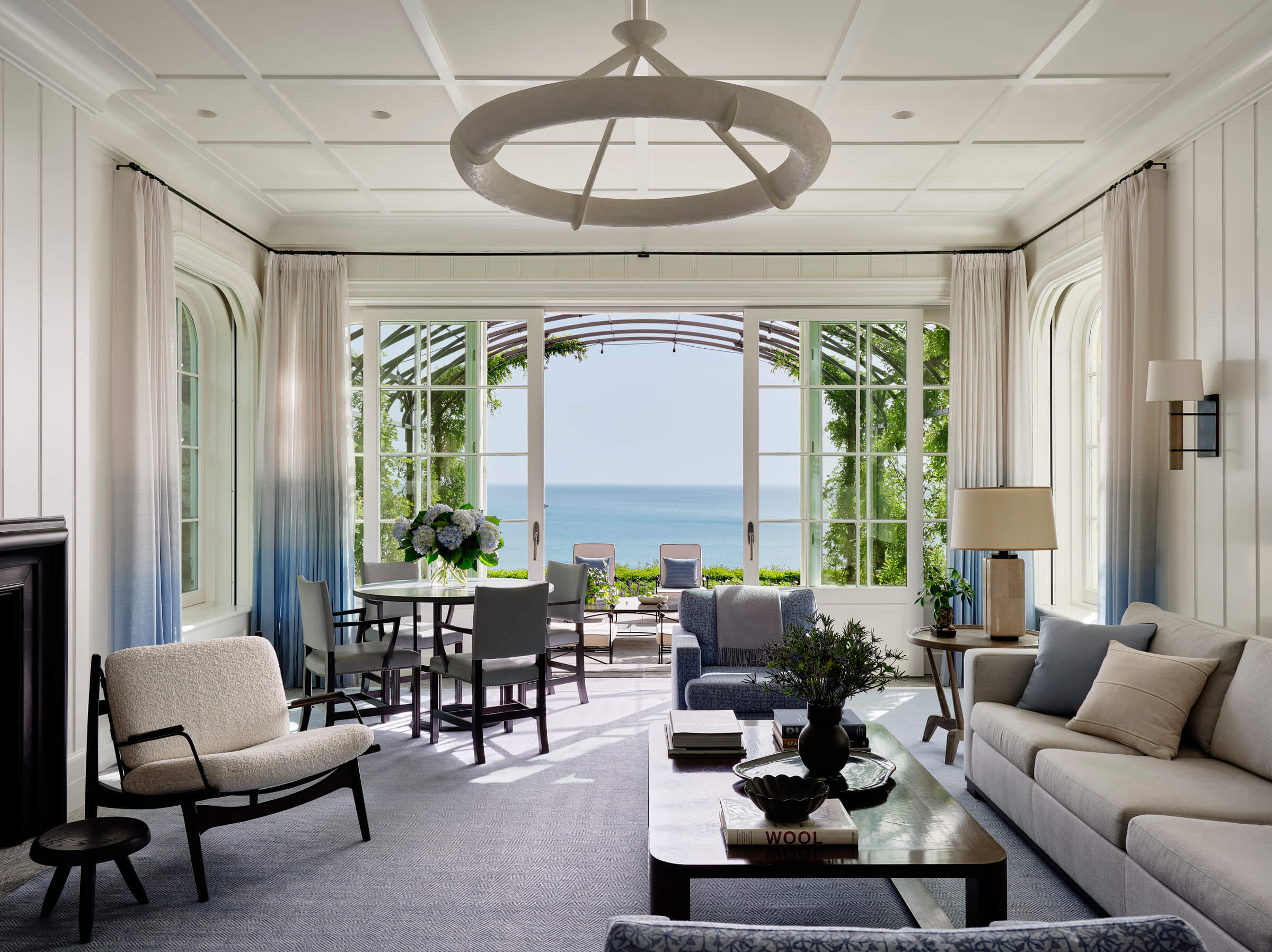 Upon entering the residence, visitors are greeted by a spacious living room that offers a direct view of Lake Michigan through a bay window. This thoughtful design ensures that the lake remains a focal point from the moment one steps inside. The living room is strategically aligned with the entry hall, creating a seamless flow and enhancing the spatial experience. This layout reflects the firm’s dedication to creating spaces that are both functional and aesthetically pleasing.
