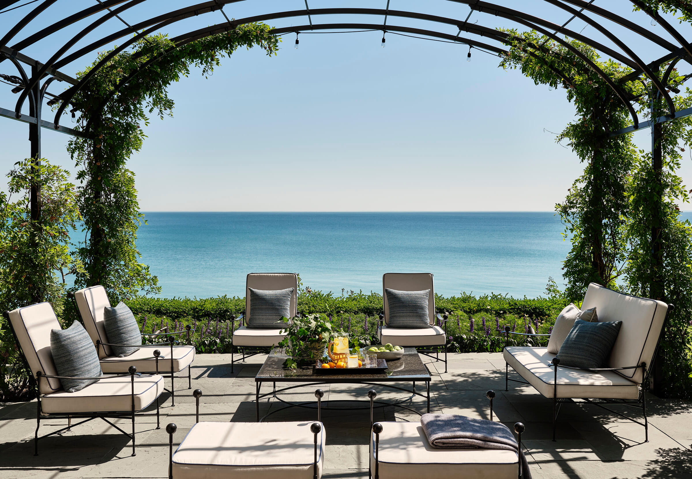 Outdoor living spaces are thoughtfully integrated into the design, providing residents with multiple areas to enjoy the lakefront setting. An open terrace adjacent to the living room offers a serene spot for relaxation, while a cozy porch off the kitchen provides a more intimate setting. The lake room, which opens to a handwrought iron pergola, serves as a transitional space between the indoors and outdoors, further blurring the lines between the two.