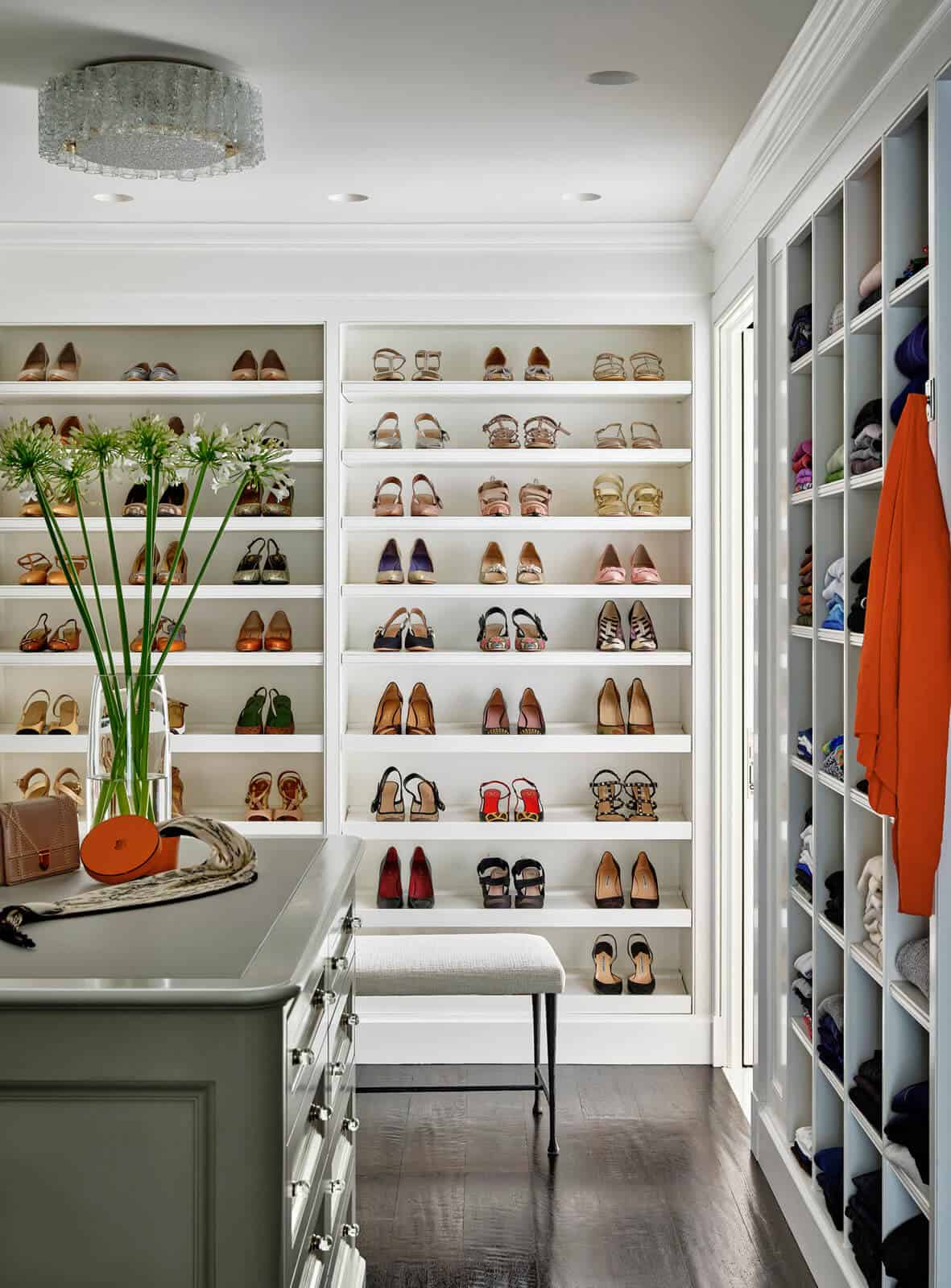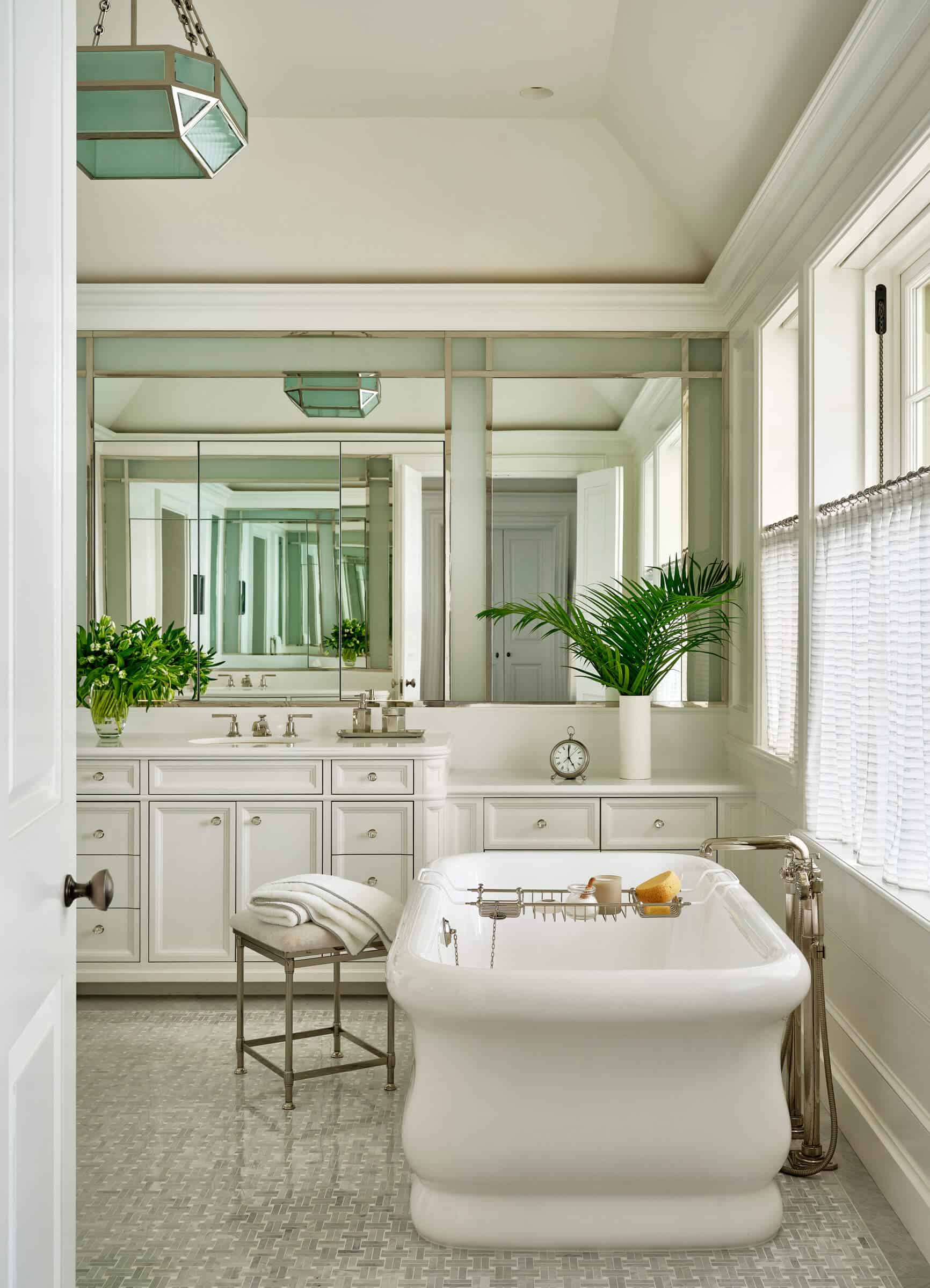 The primary suite, located on the upper floor, continues the theme of lake-centric design. From the stair landing, one can view the lake through the sitting room of the suite, emphasizing the residence’s connection to its natural surroundings. The rooms on both floors are arranged enfilade, ensuring that each space offers a view towards the lake, thereby reinforcing the residence’s harmonious relationship with its environment.