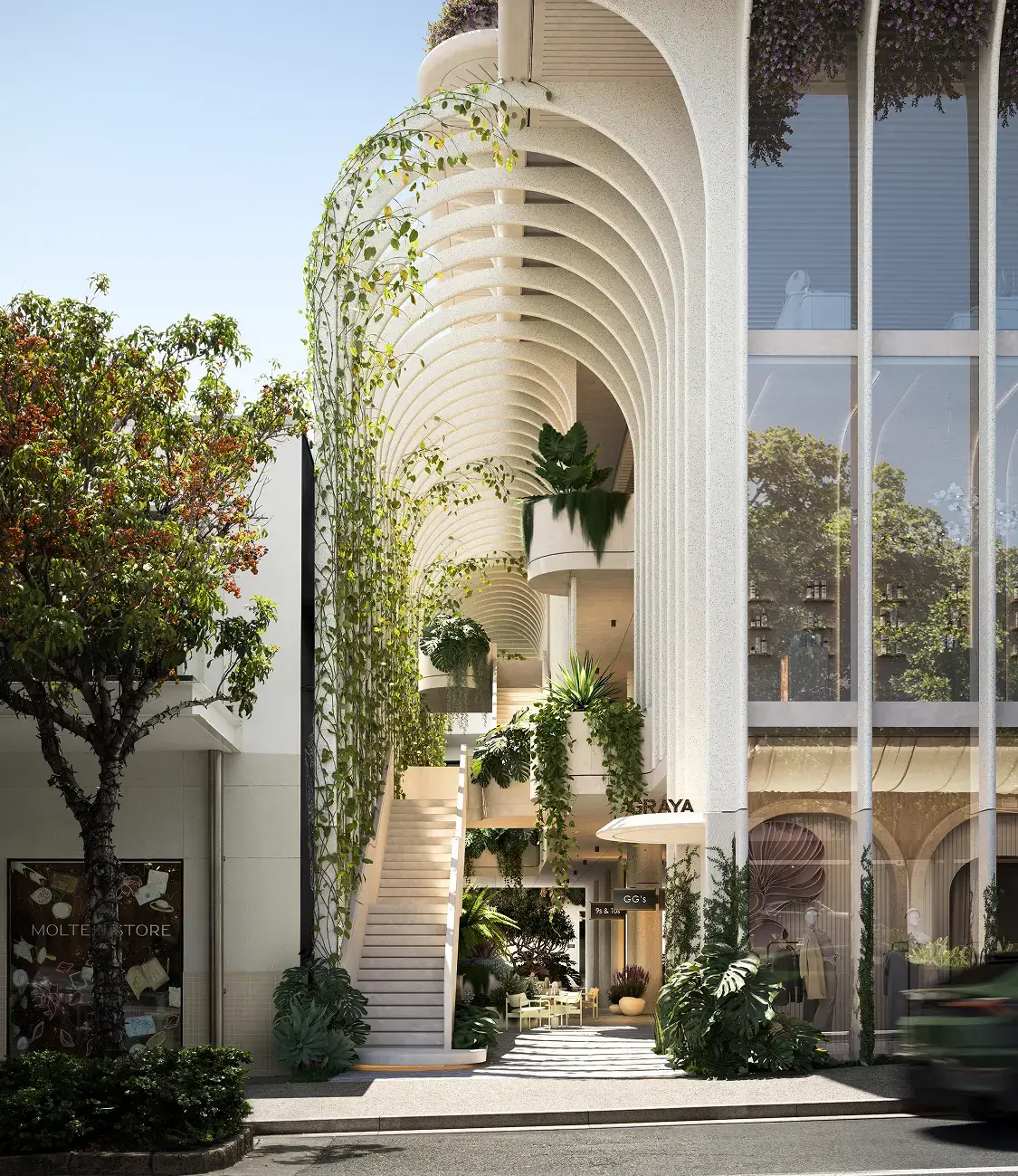Koichi Takada’s design philosophy, known for integrating nature-inspired and human-centric elements, is evident in the Pavilion’s architecture. The building’s sculptural forms and lush greenery aim to complement James Street’s leafy, urban charm. A central architectural staircase will ascend through the building, framing views of the James Street precinct and enhancing the connection between different levels. The rooftop garden will provide tenants and visitors with elevated views of the city, offering a natural retreat above the urban streetscape.