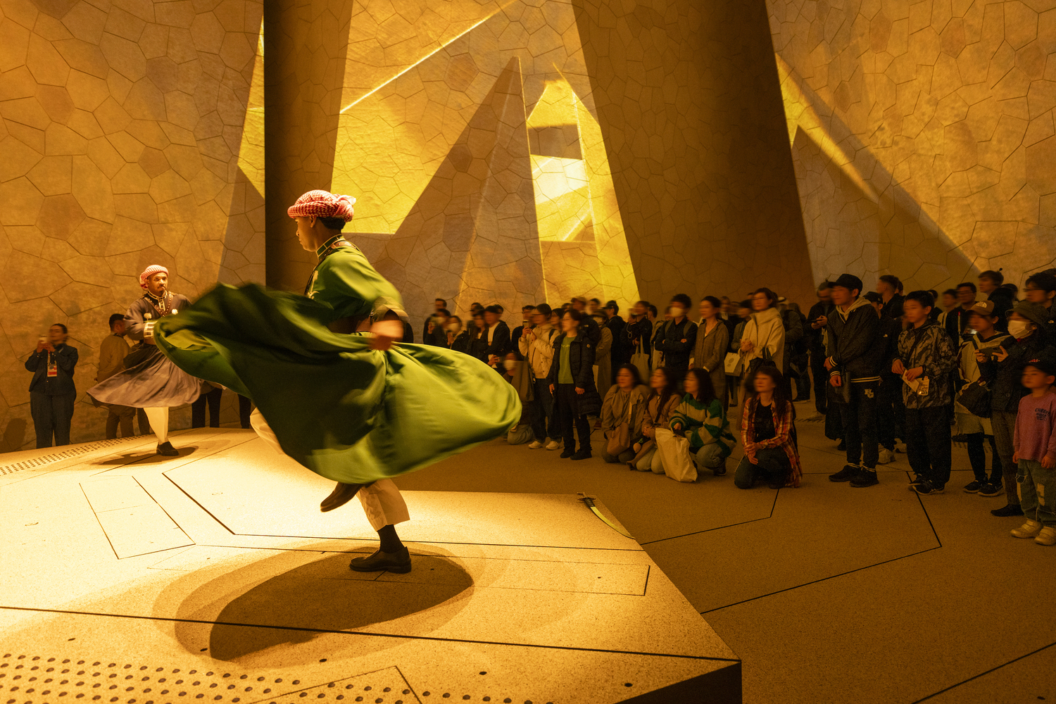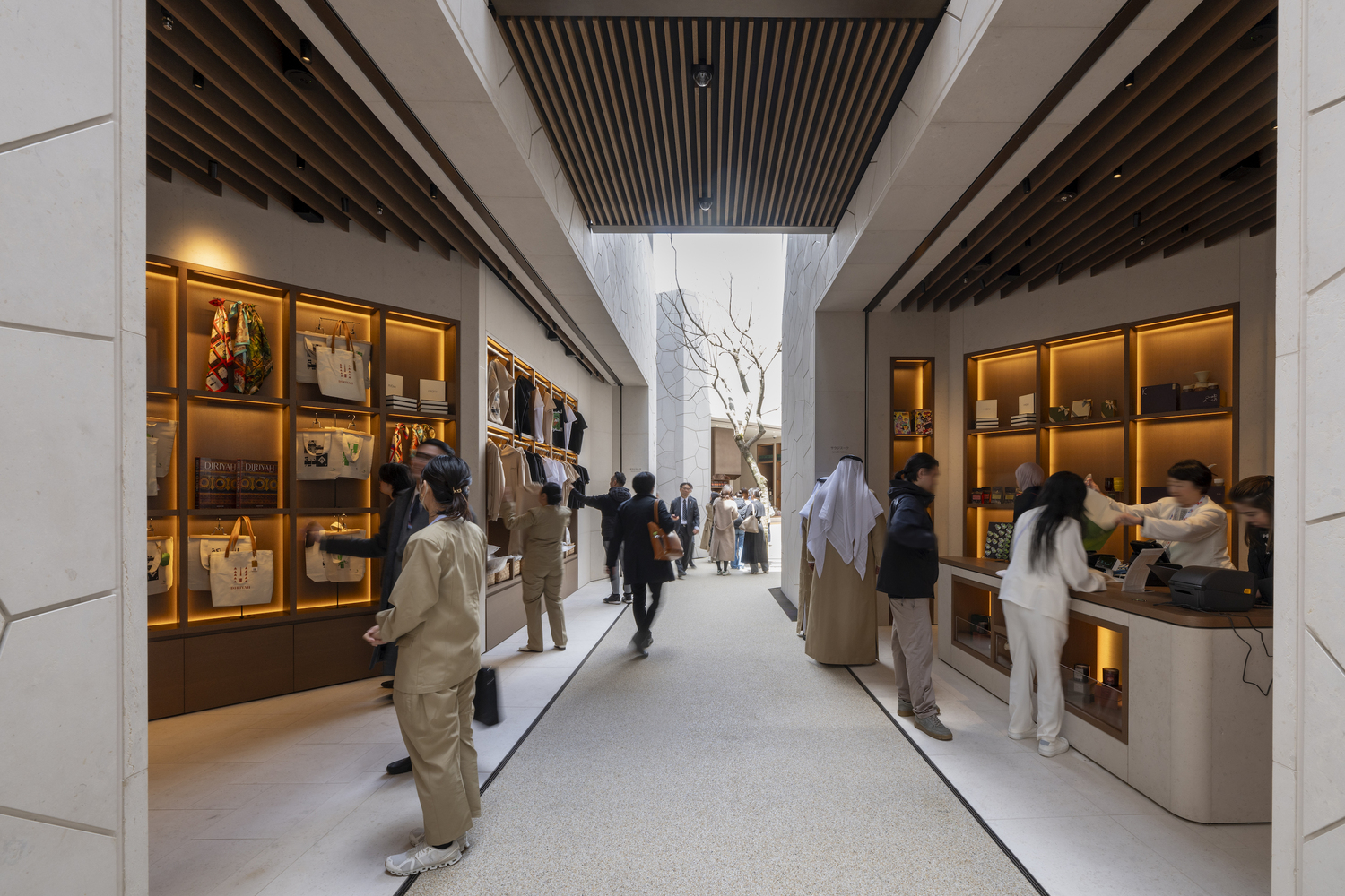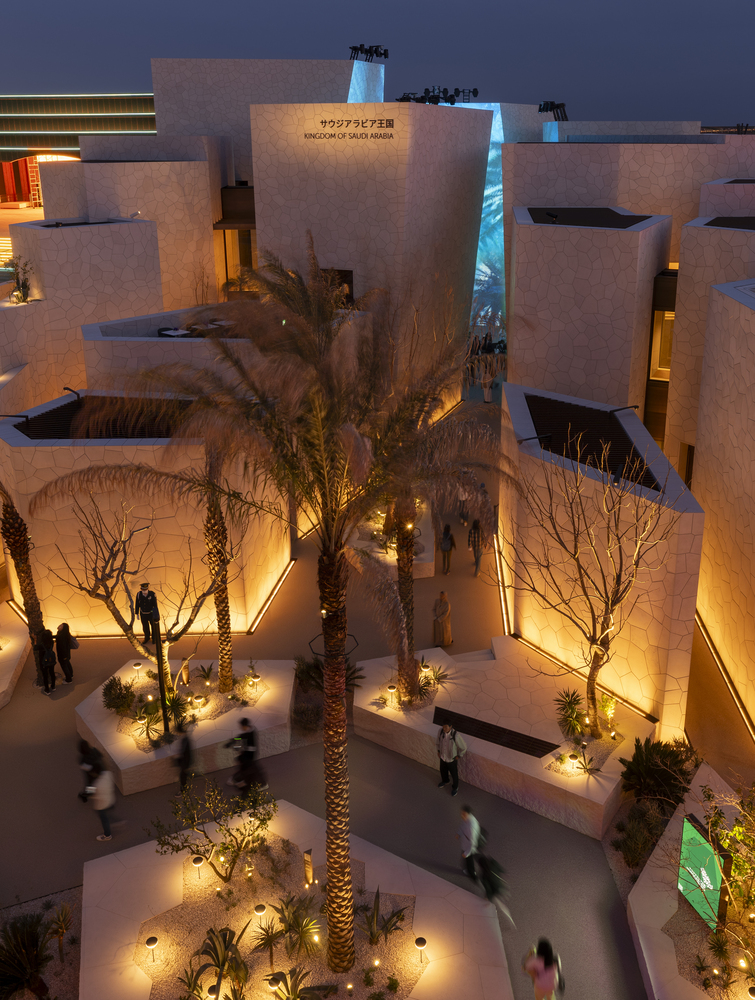 Visitors are welcomed through a lush forecourt adorned with native Saudi Arabian flora, leading them into a series of narrow streets that guide them to the Saudi Courtyard—the heart of the pavilion. This central space serves as a tranquil retreat during the day and transforms into a vibrant venue for performances and events at night, embodying the dynamic cultural life of Saudi Arabia.