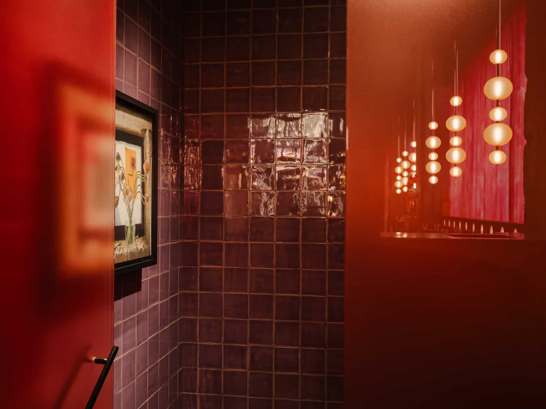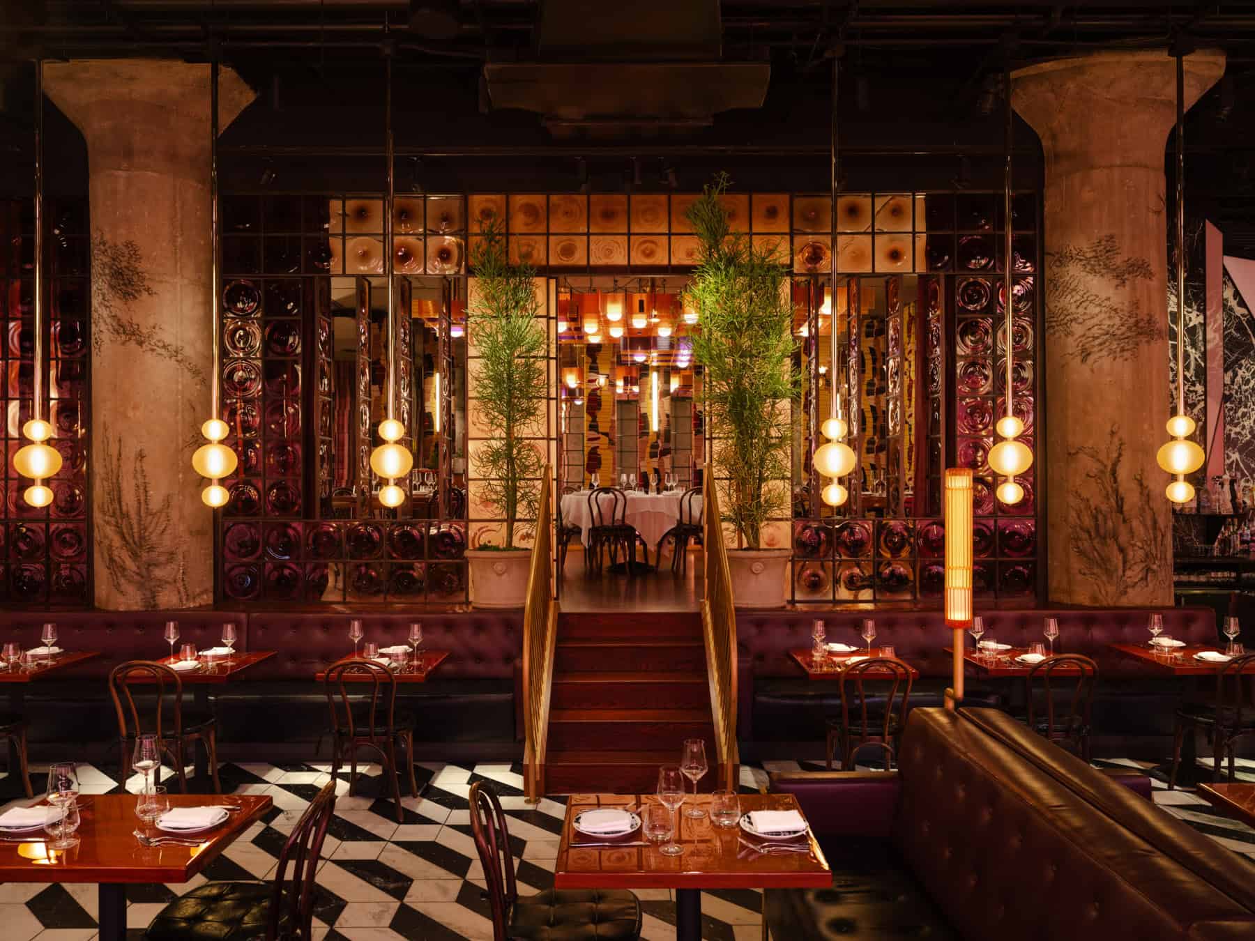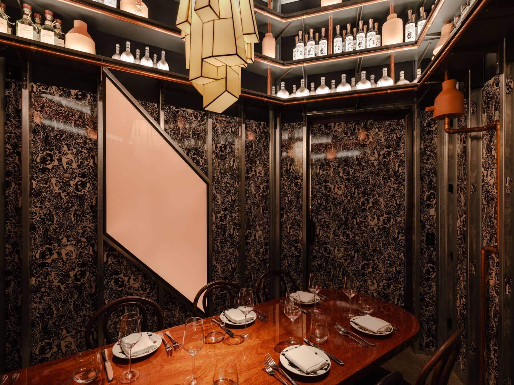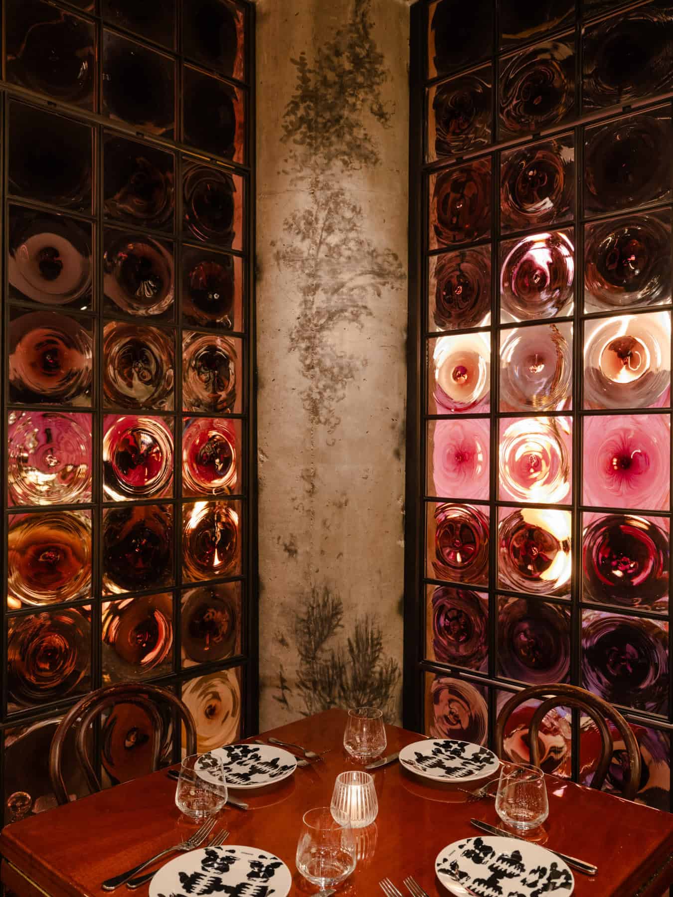 Custom glass and lighting installations further enhance the restaurant’s unique ambiance. A former loading dock has been transformed into a private dining room, glazed with violet bullions, offering an intimate setting. Breezeblock walls, steel-framed glass, and lattice-like chandeliers introduce layers of rhythm and reflection, adding depth to the design.