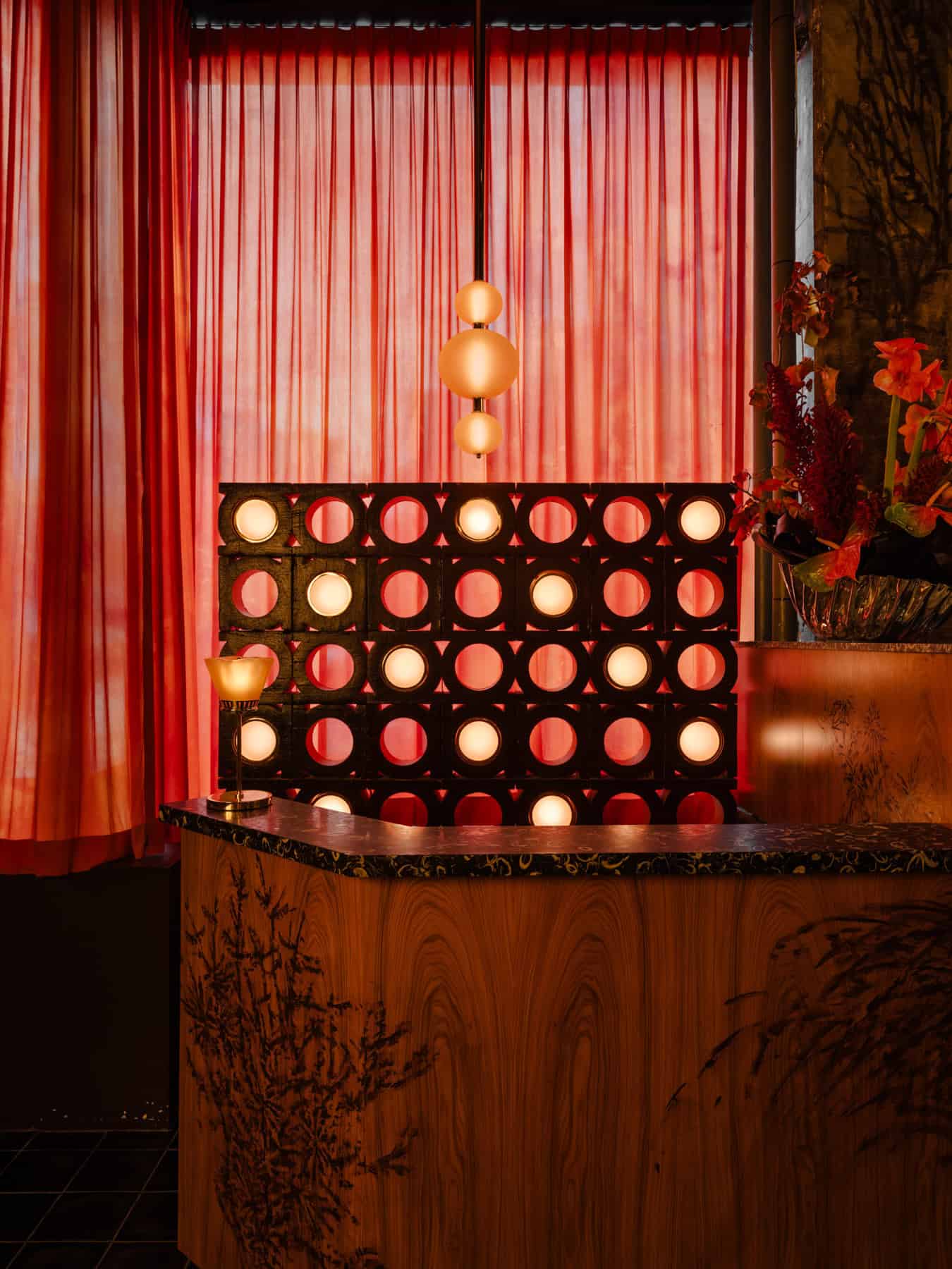 The main bar features abstract planes of peach, amber, and pale violet light, set against honed marble slabs embedded with black limestone clasts. These elements create a dynamic visual experience, blending warmth and texture. In the main dining area, sheer curtains dyed with natural hues filter light into an orange sherbet glow, complemented by monumental chandeliers and a bold black-and-white trapezoid marble floor.