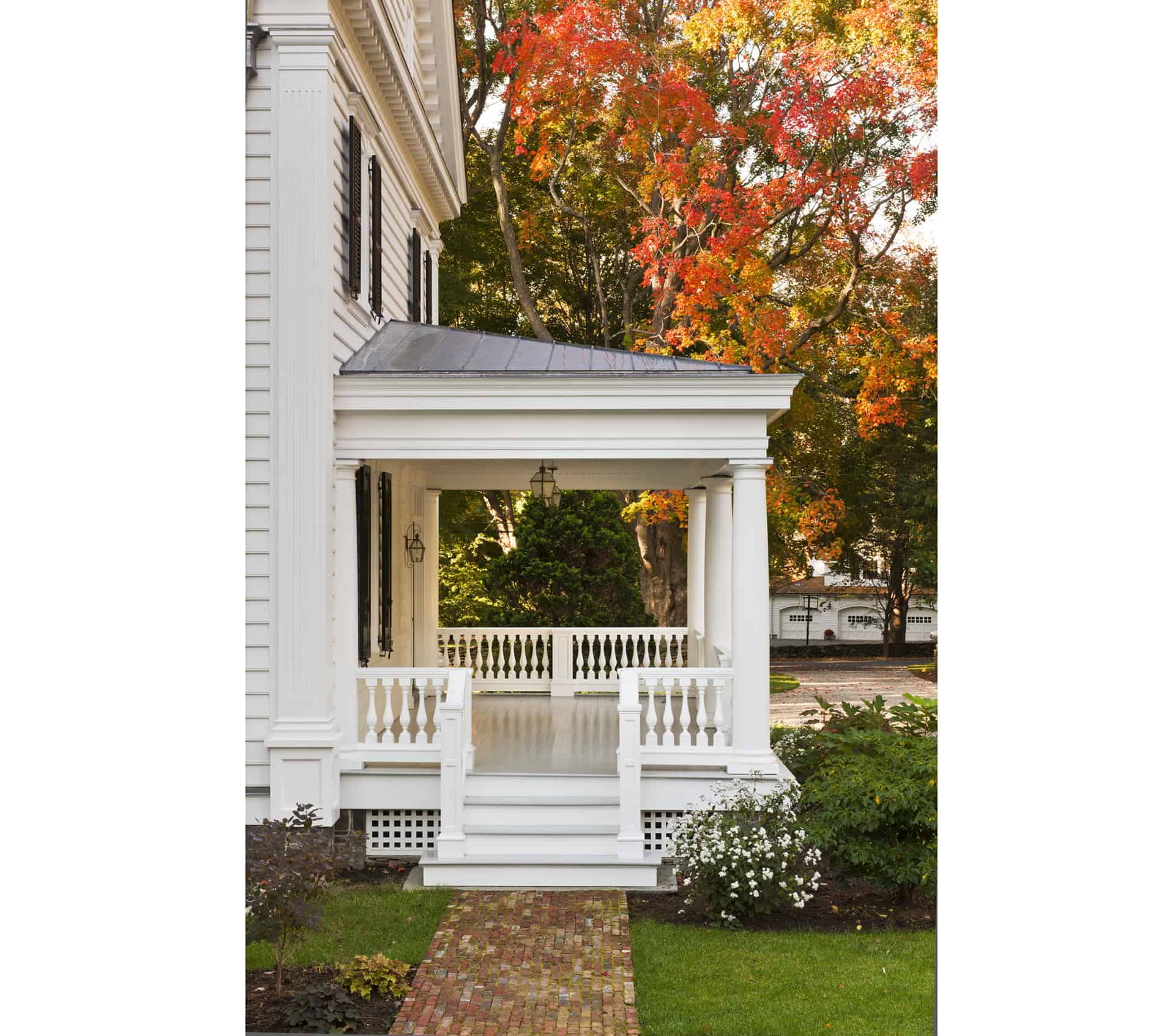 The exterior materials were carefully selected to reflect the traditional New England aesthetic. The house features ¾-inch beaded clear mahogany clapboard siding, complemented by a cedar shingle roof. The foundation base is constructed from salvaged stone, adding a sense of history and continuity to the design. Multiple porches, constructed of mahogany and topped with lead-coated copper roofs, provide outdoor living spaces that connect the interior to the surrounding landscape. The doors are layered with dense paint, giving them an appearance of having been painted over the years, further enhancing the home’s timeless character.