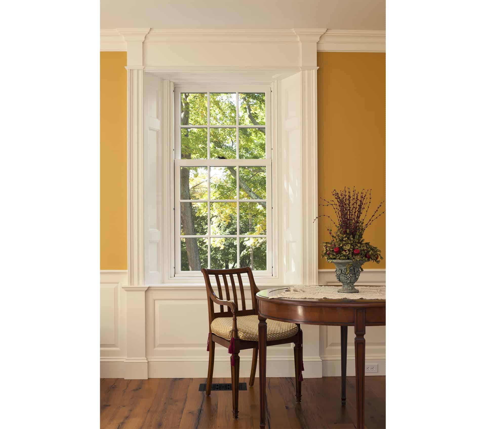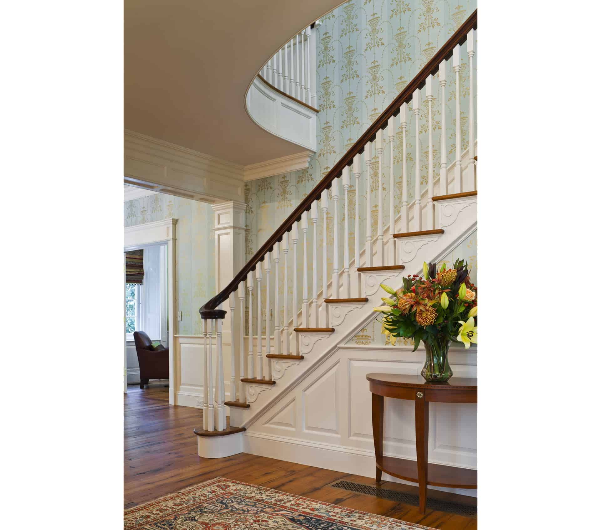 The interior spaces were designed to reflect the formal Georgian elements of the exterior. Fluted corner pilasters, brick chimneys, half-round window dormers, and windows with heads and mahogany shutters contribute to the classical detailing. The Classically detailed soffit, fascia, and rake further reinforce the formal aesthetic. These elements correspond to the formal spaces within the home, creating a harmonious relationship between the interior and exterior.