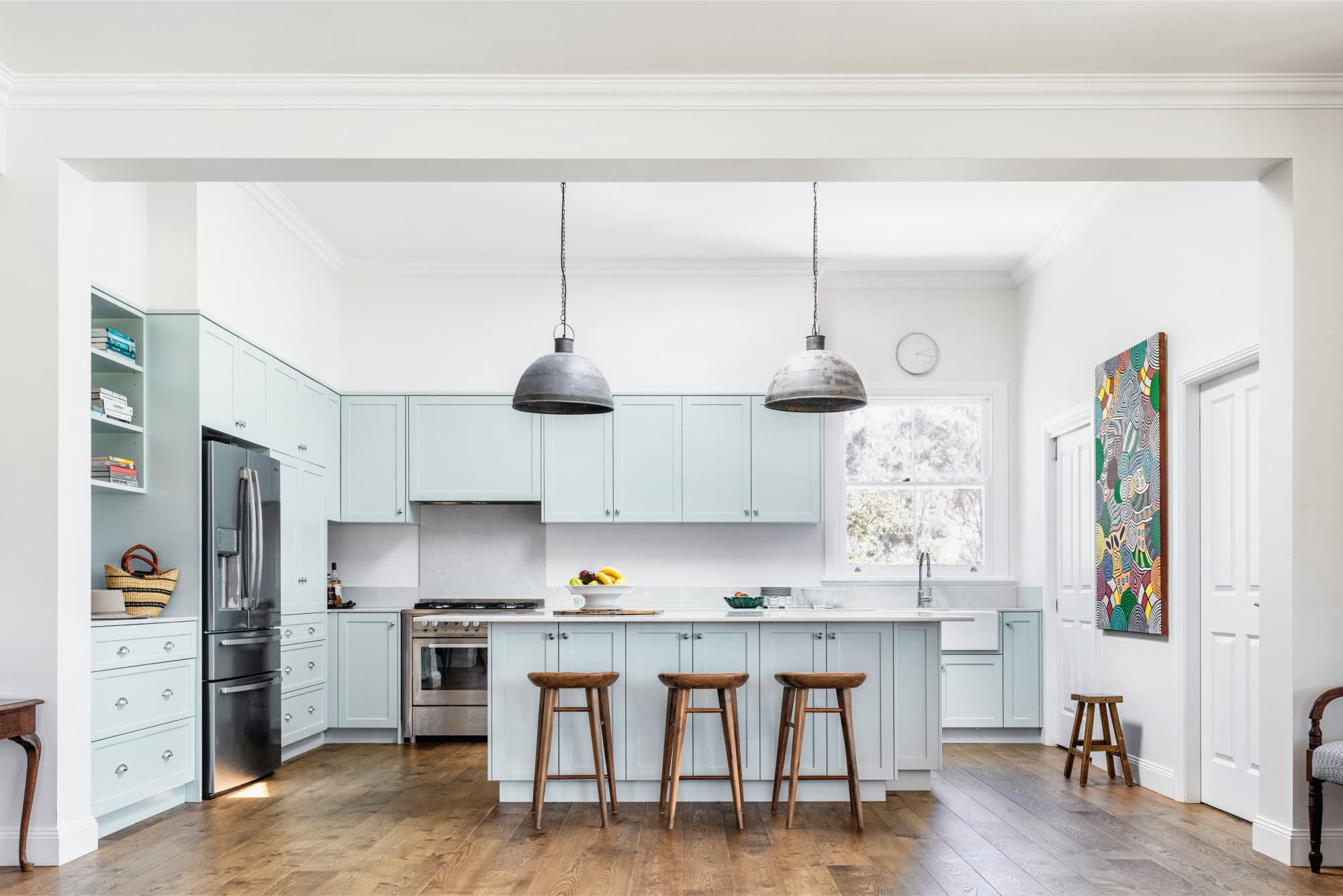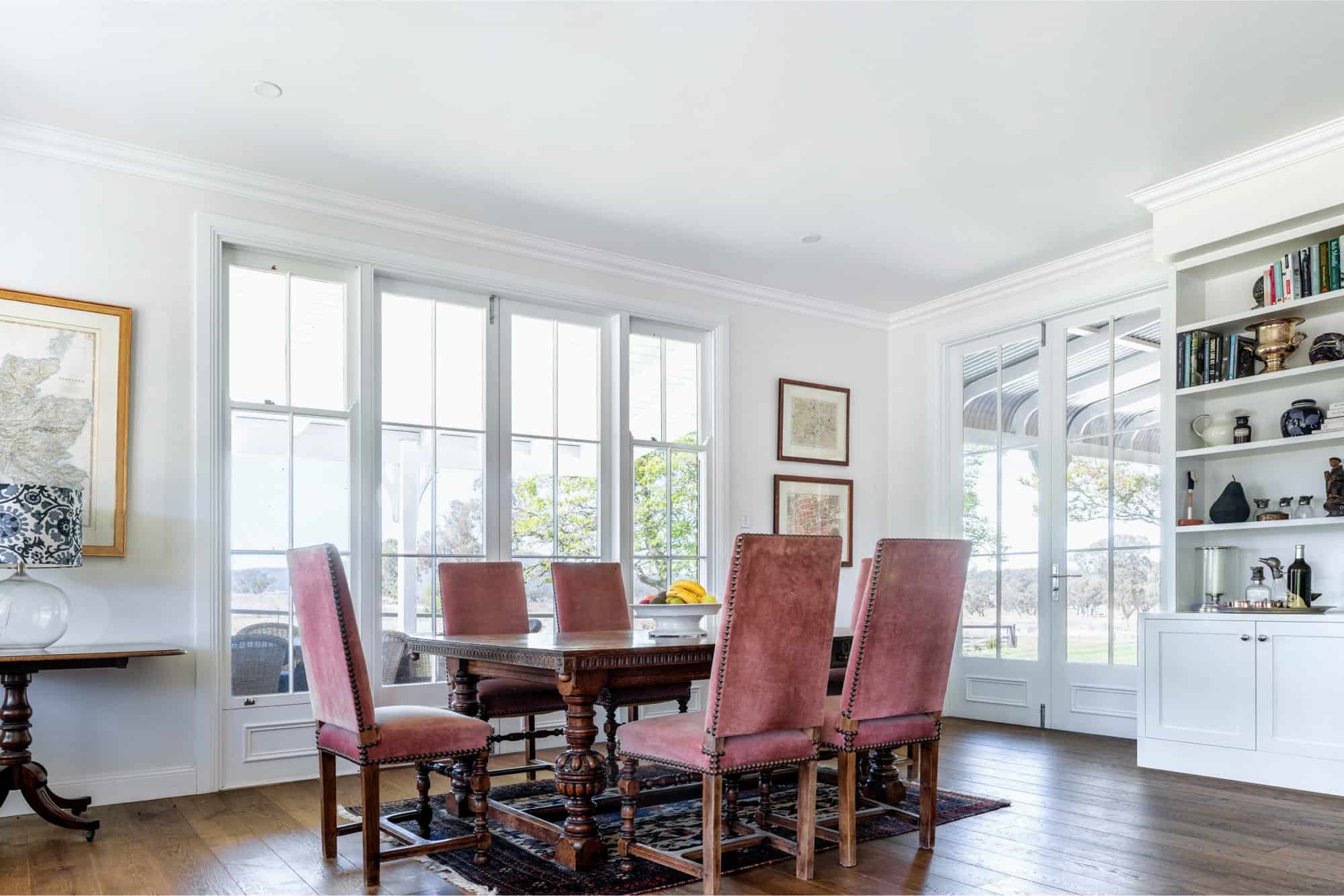 Michael Bell’s design approach for Myanbah focused on creating a harmonious blend of old and new. The renovation included an expansive open-plan living and dining area, with a functional kitchen at one end and a more formal dining space at the other. The kitchen, central to the family’s daily life, features a large island bench that serves as a gathering point. French doors were added to the main bedroom, opening onto a broad verandah, and additional French doors connect the living area to the verandah, framing picturesque views of the surrounding landscape.