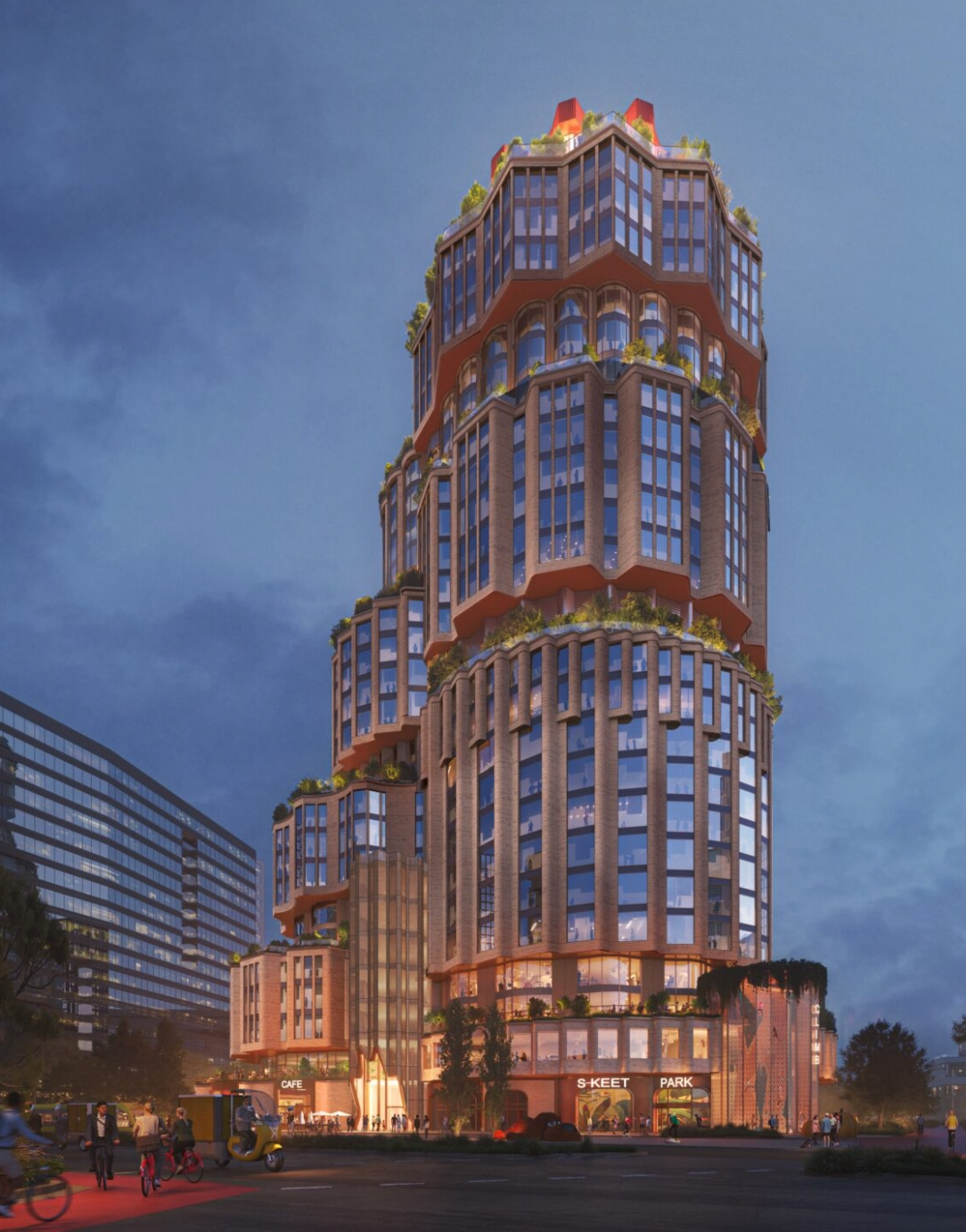 A bicycle shed and a mobility hub will occupy an entire floor, providing a natural nexus for anyone passing through the Netherlands’ busiest train station nearby. The design also includes multiple landscaped terraces, some of which will be reserved solely for the city’s wildlife residents, enhancing the building’s connection to nature.