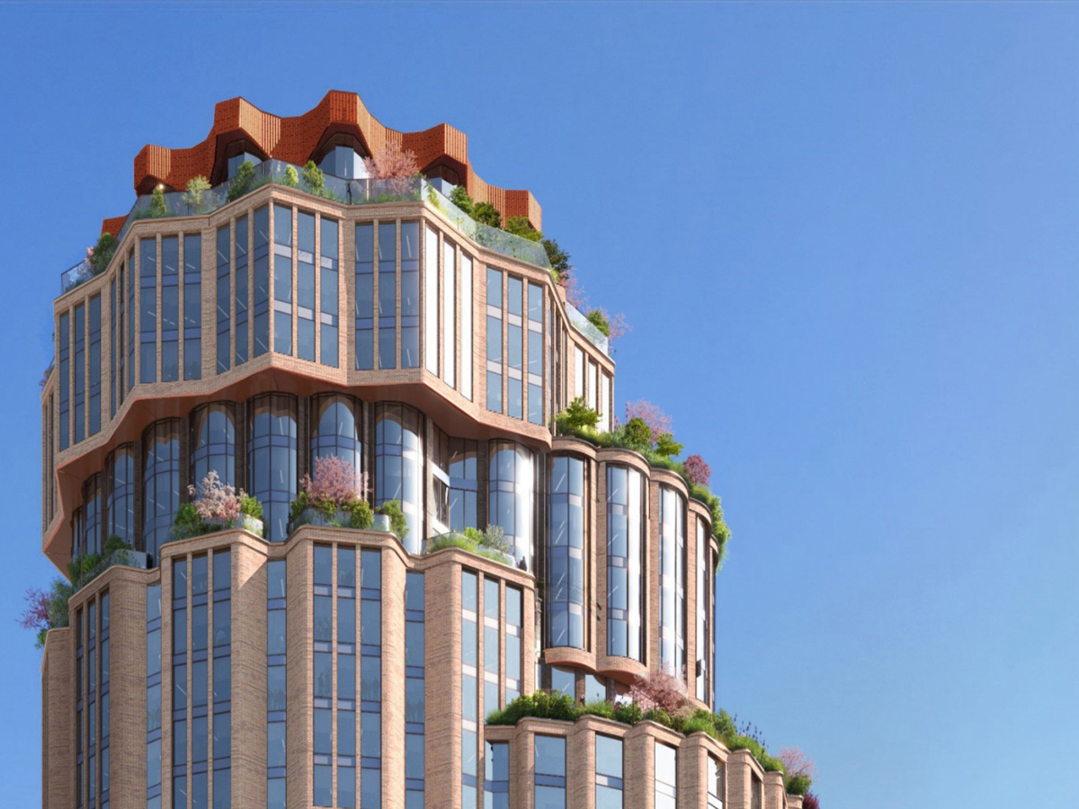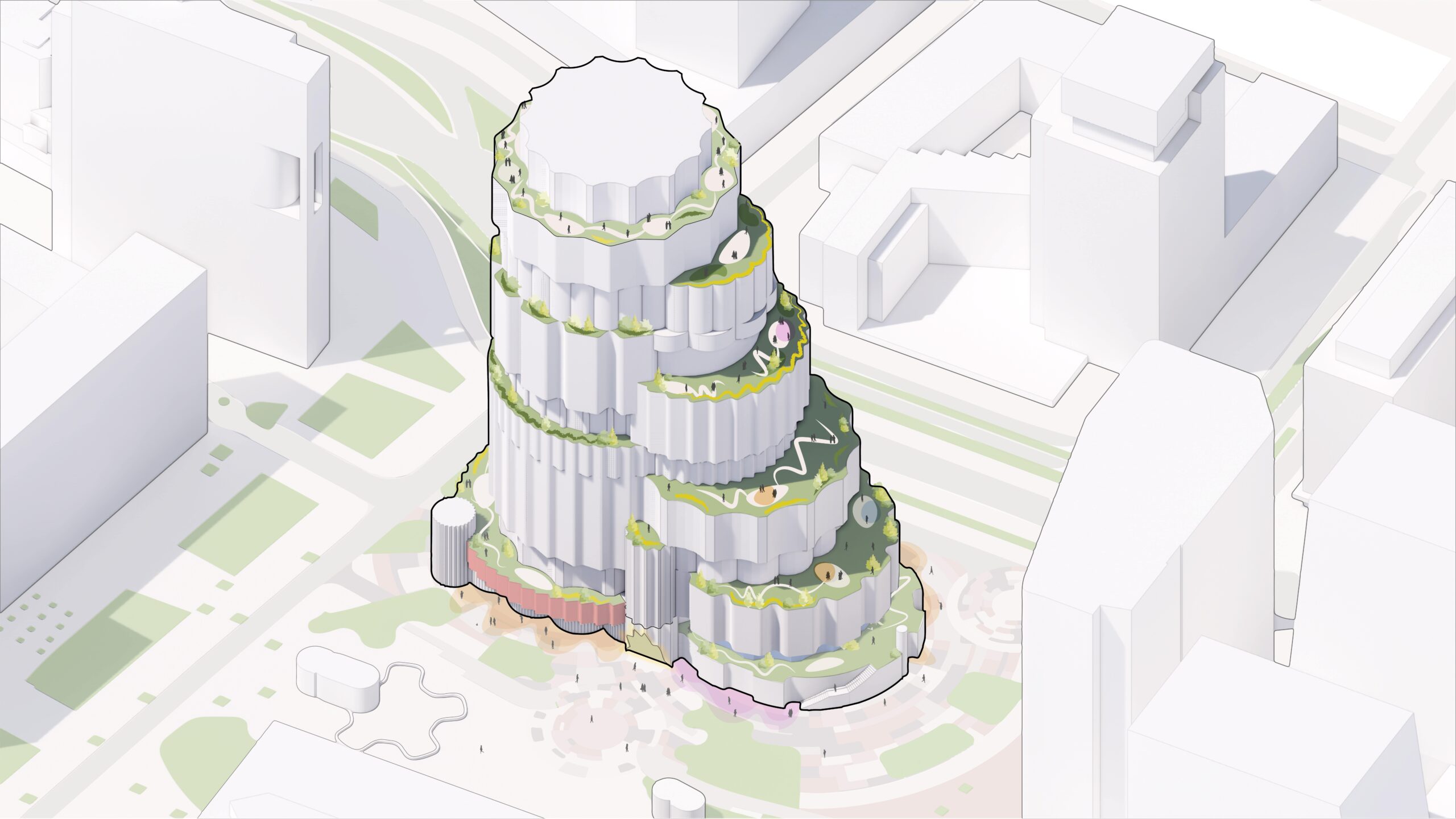 The building’s design features a series of stacked cylindrical forms, topped with landscaped terraces, creating a distinctive silhouette that contrasts with the surrounding angular structures. This unique form is intended to stand out against the backdrop of the neighborhood, marking the building’s presence and creating a new cultural destination in the city.