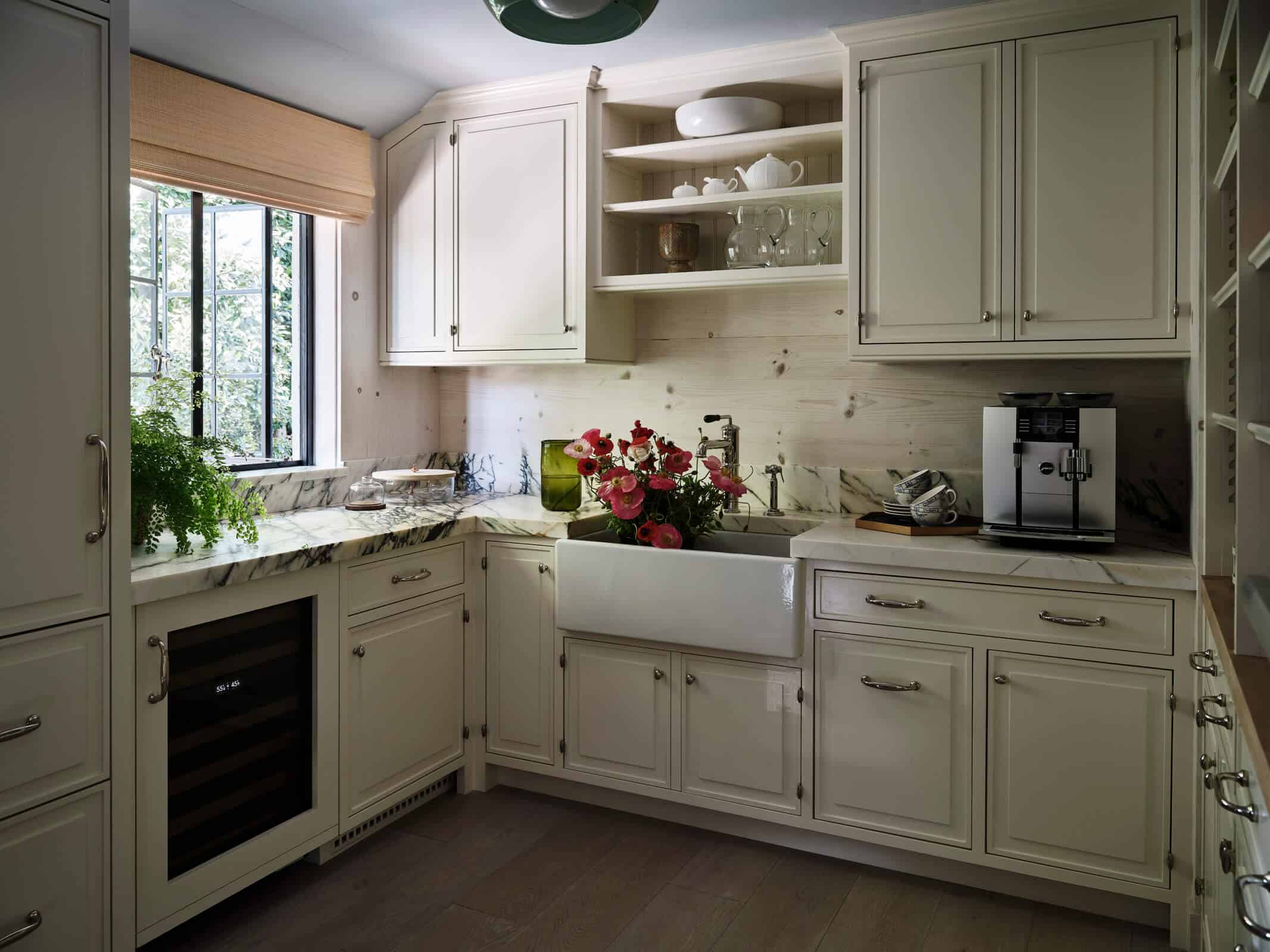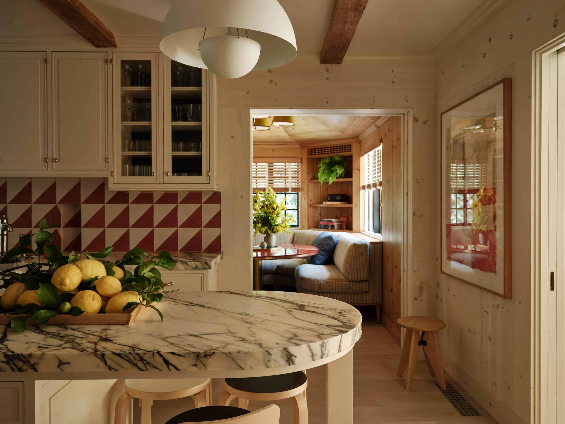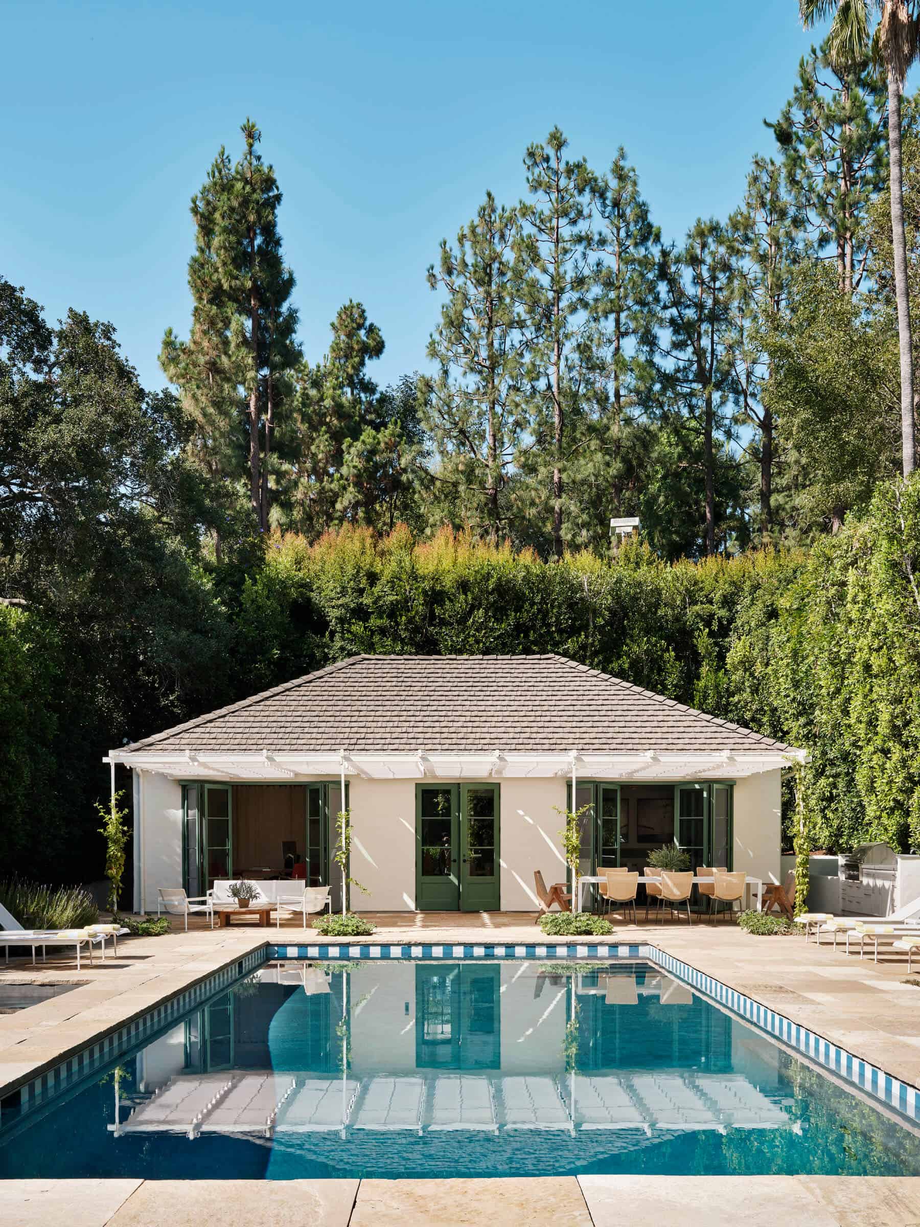 Collaboration with landscape designer Deborah Nevins resulted in a more gracious sequence of hardscape and plantings, linking the main house to a new pool located on the property’s upper reaches. Whitewashed wood-plank walls and a pitched ceiling transformed the outwardly modest pool house into a light and airy retreat. A screening room on the lower level doubles as a working space for the owner, showcasing the home’s versatility.
