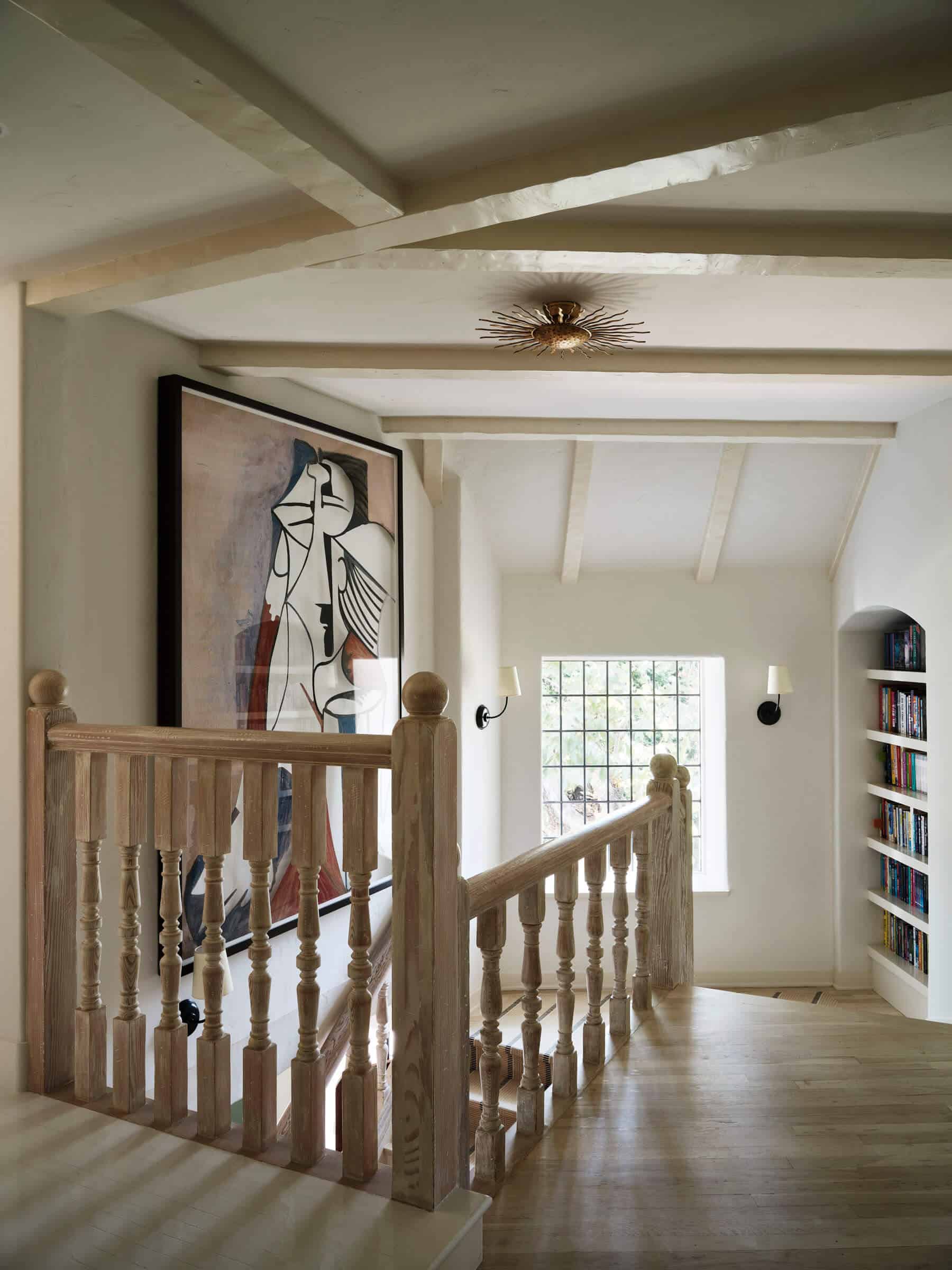 The living room received significant improvements, with later additions removed to reveal Pierpont’s original design. The restored space now boasts white-painted timber beams and windows, allowing natural light to flood the room and highlighting the home’s historical features.