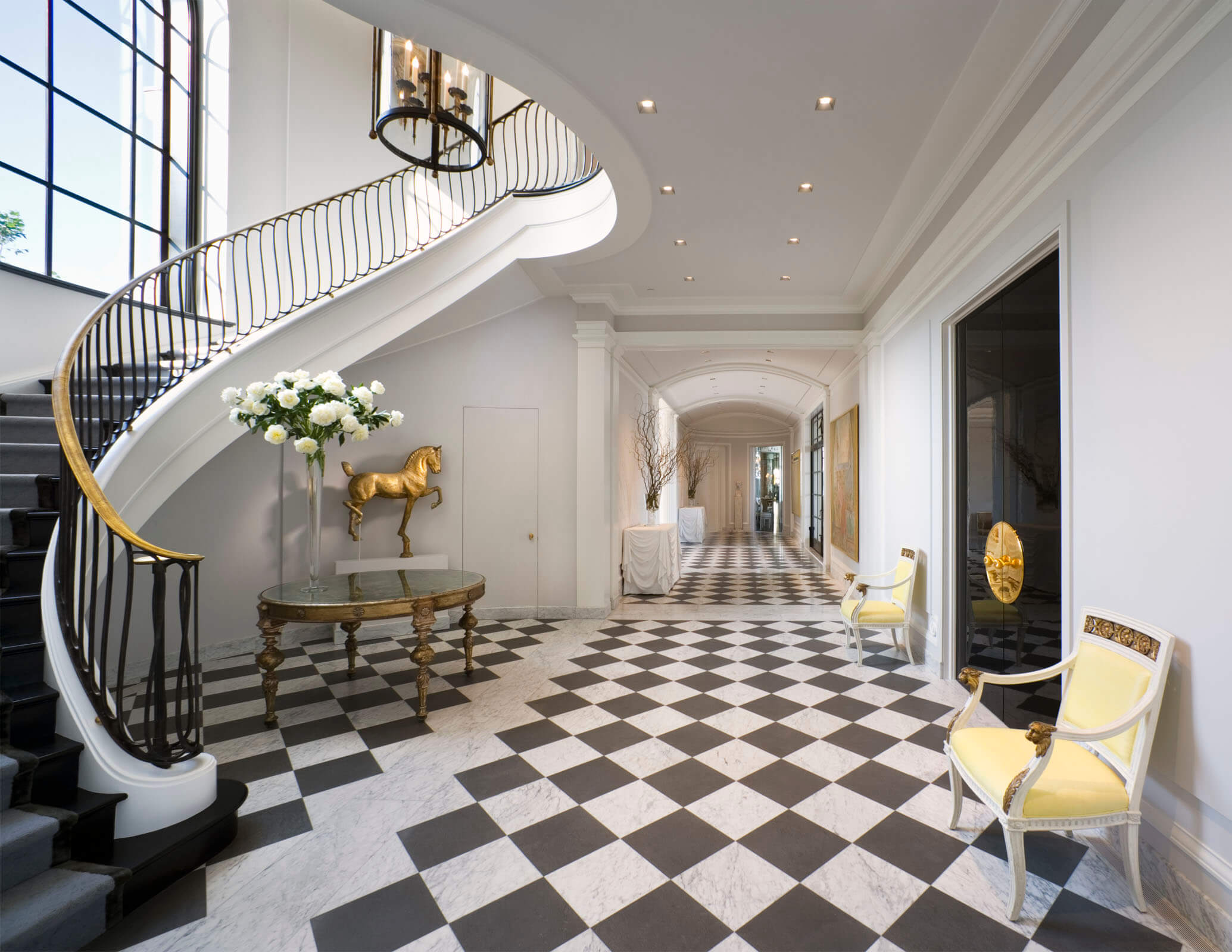 The exterior of the Residence in California is characterised by a rich monochrome palette that recalls the elegance of black-and-white movie sets from an earlier era. White painted brick, gray limestone, black steel windows, and extensive decorative ironwork come together to create a cohesive and sophisticated facade. This design approach not only pays homage to the cinematic past but also establishes a strong visual identity for the house within the diverse architectural landscape of Los Angeles. The use of these materials ensures durability and a sense of permanence, while the decorative ironwork adds an element of artistry and craftsmanship to the overall aesthetic.