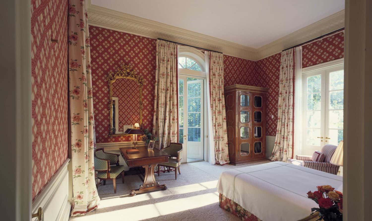 The south-facing facade of the residence is rendered in stucco, complemented by French limestone detailing, exuding a timeless elegance. This facade is flanked by two attached garden pavilions: one an open-air loggia and the other serving as the master bedroom. On the opposite side, a walled entry courtyard is framed by the main house and service wing, creating a welcoming and private entrance. Inside, an orangerie-like gallery opens onto the courtyard, providing a serene space that bridges the indoor and outdoor environments. Above the gallery, dormered hallways overlook the patterned courtyard parterre, offering picturesque views and enhancing the home’s architectural depth.