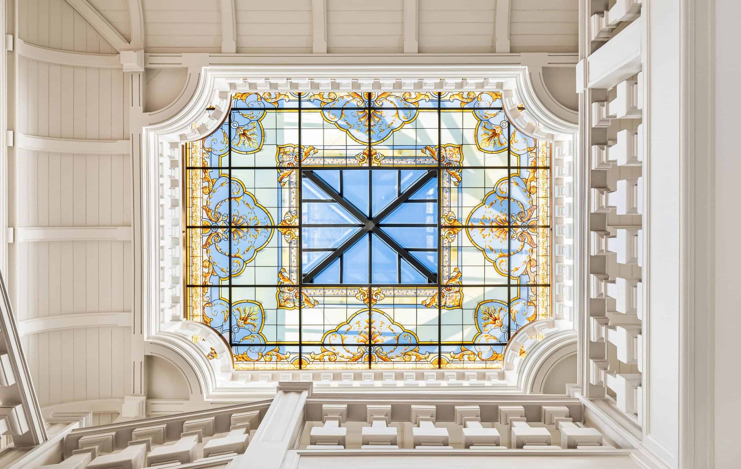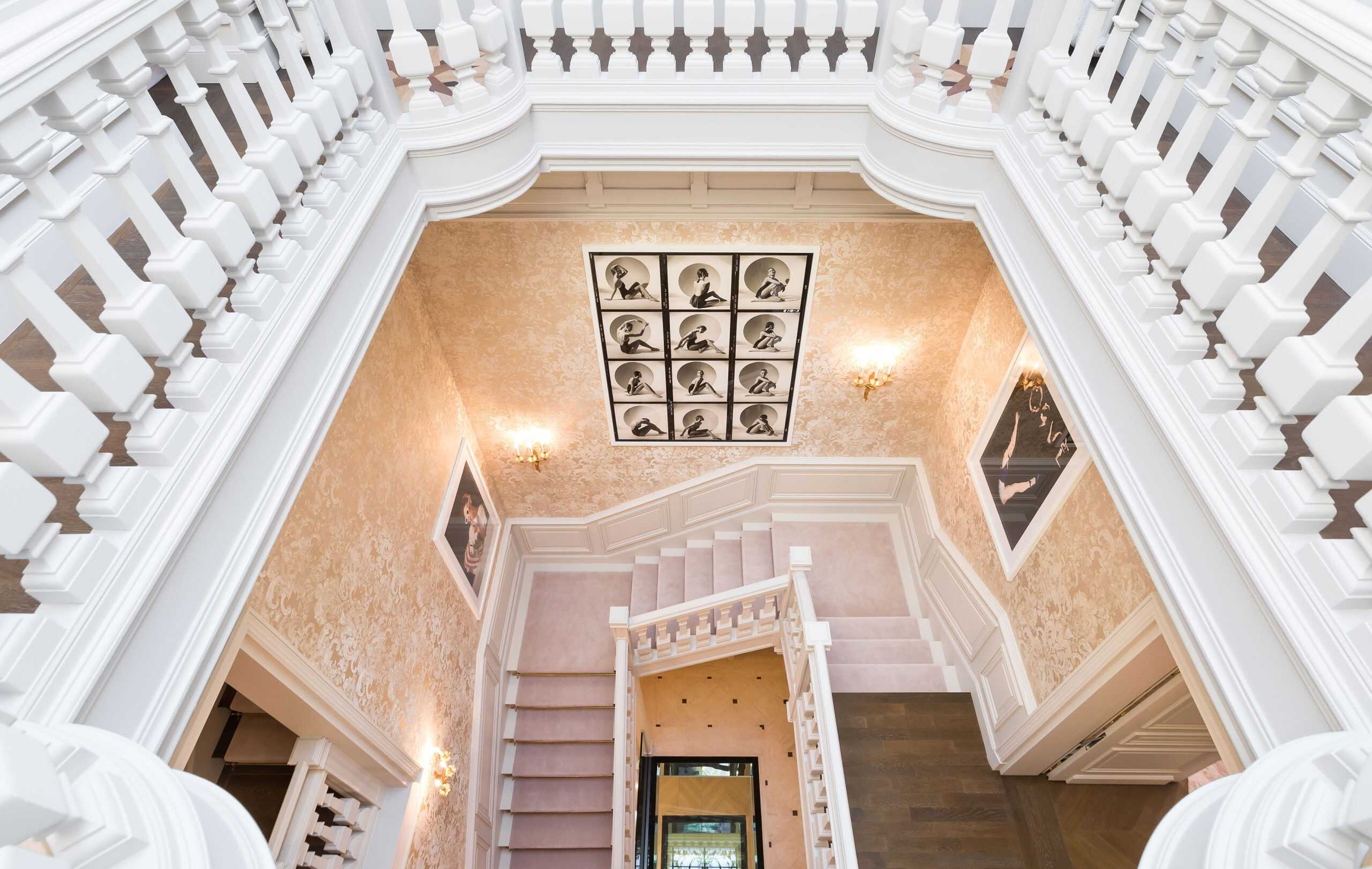The interior design of Trésor Caché is the result of a unique collaboration between designers and artists, with the starting point being the house’s rich history. COGEMAD restored the remarkable ceiling frescoes dating back to 1885, preserving the property’s historical charm. Natural light permeates the space through the original glass roof, illuminating every floor and creating a dynamic interplay of light and shadow across the furnishings and artworks that adorn the property.