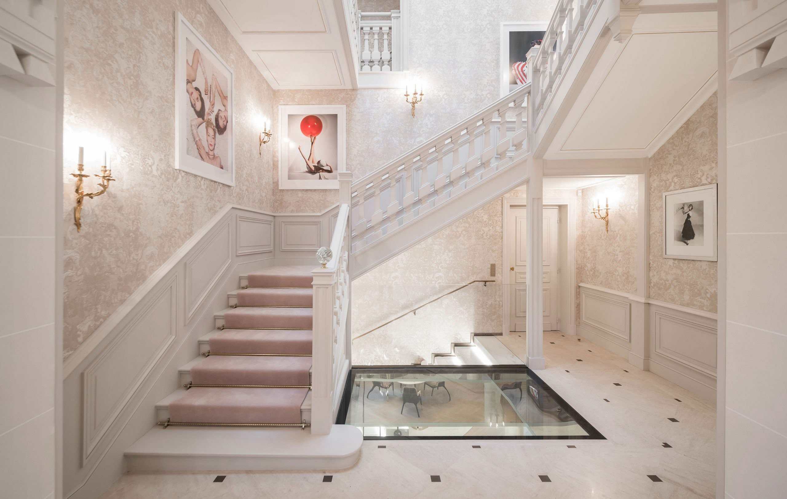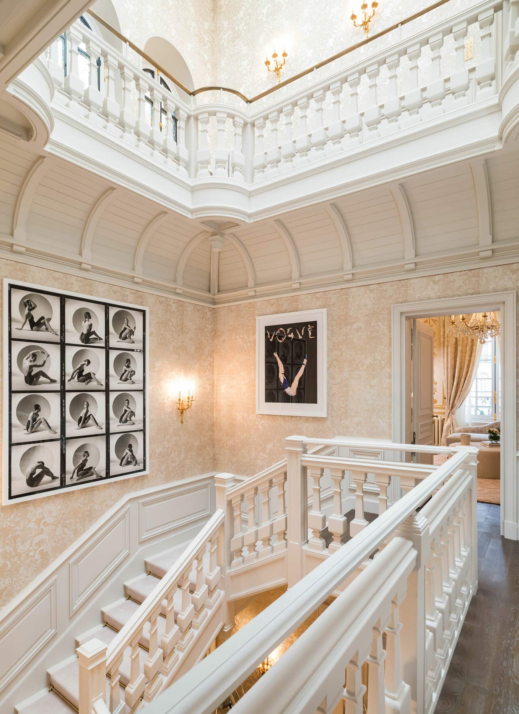 Descending the helical staircase, a glimpse of the 16-metre swimming pool is visible through a glazed wall. The pool area is complemented by a gym, hammam spa, and massage room, leading off from the pool lobby. The ‘floating’ staircase, a masterpiece of both design and engineering, is created by hand, reflecting a freestanding curve and crafted using the famous French limestone ‘Magny Le Louvre’.