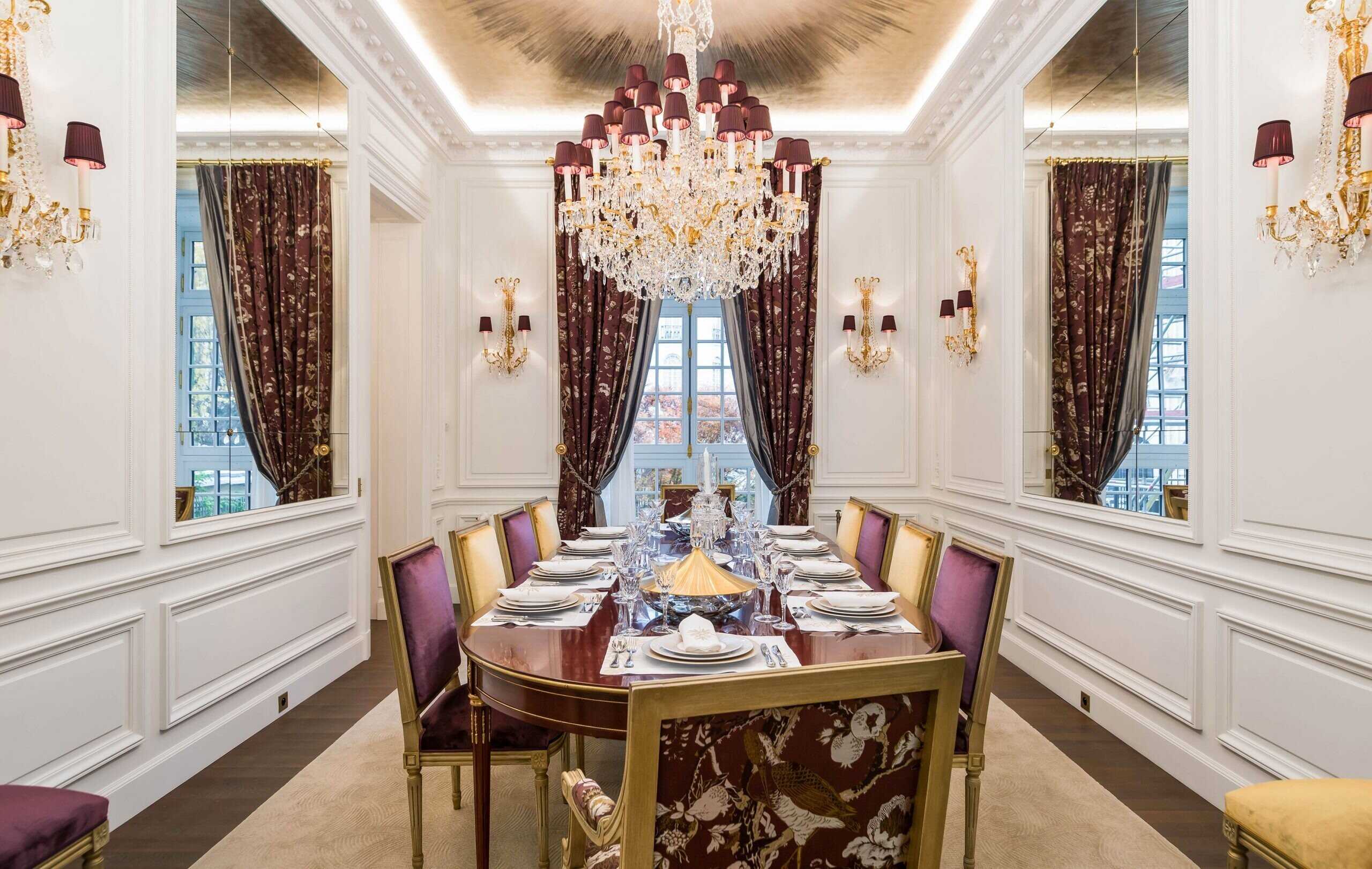 The formal dining room, designed to accommodate twelve guests, is ideal for entertaining. Walls adorned with aged mirror panels complement aubergine-hued chandelier lampshades and matching chairs, creating an elegant and inviting atmosphere. The ceiling, embellished with gold leaf, enhances the magnificent crystal chandelier, while behind the glass doors, the exquisite La Cornue kitchen awaits, ready to delight guests with its culinary offerings.