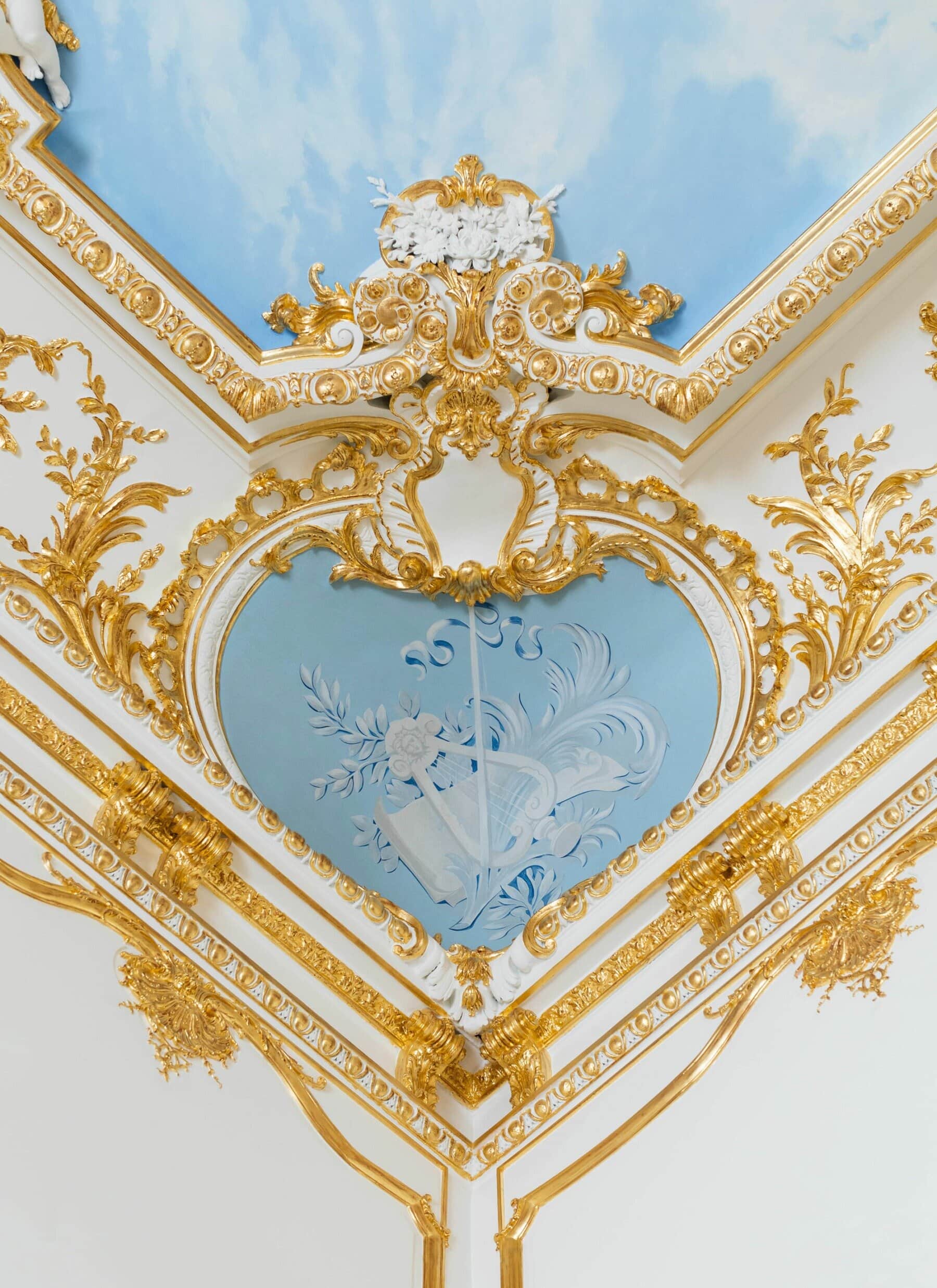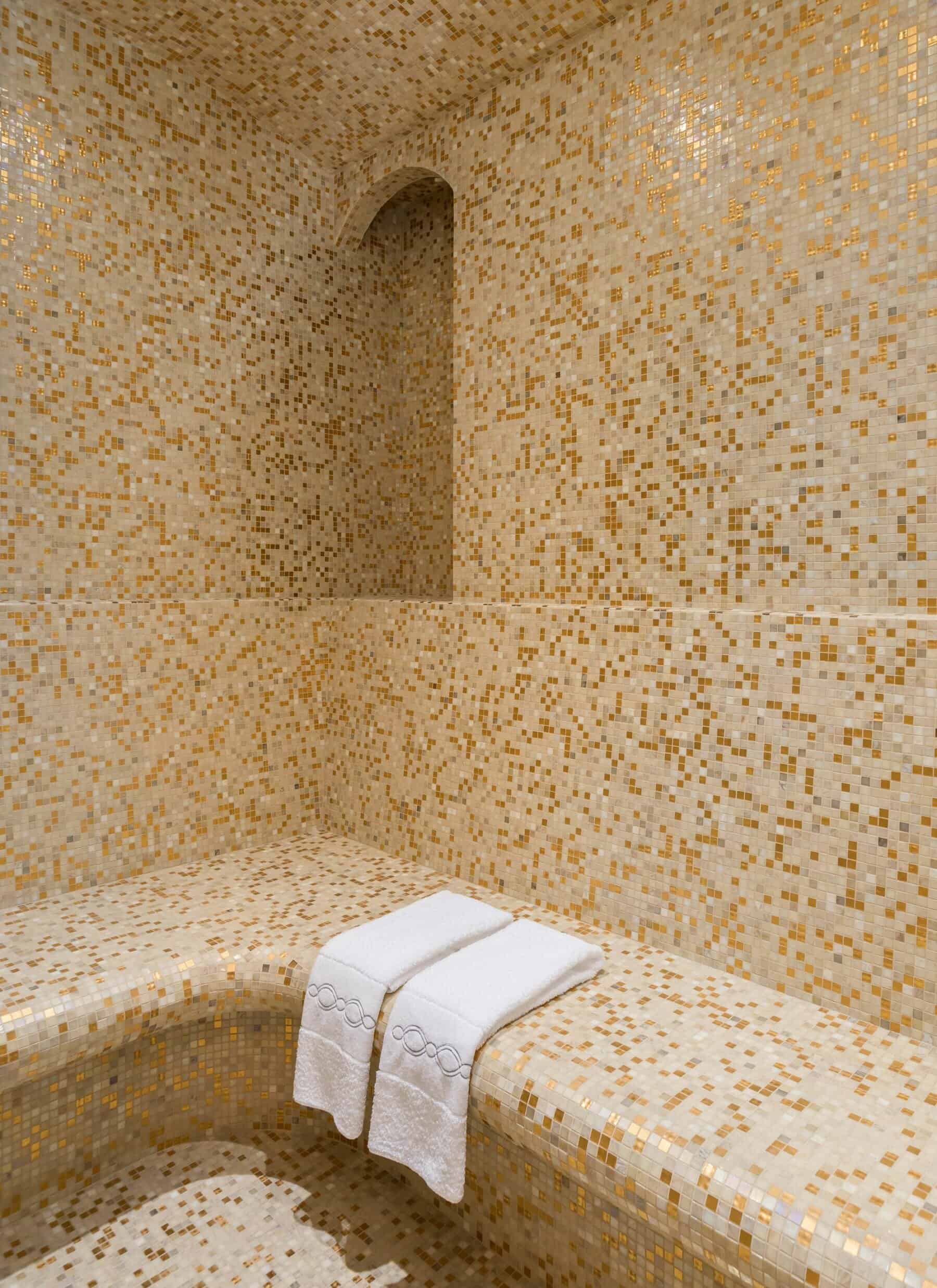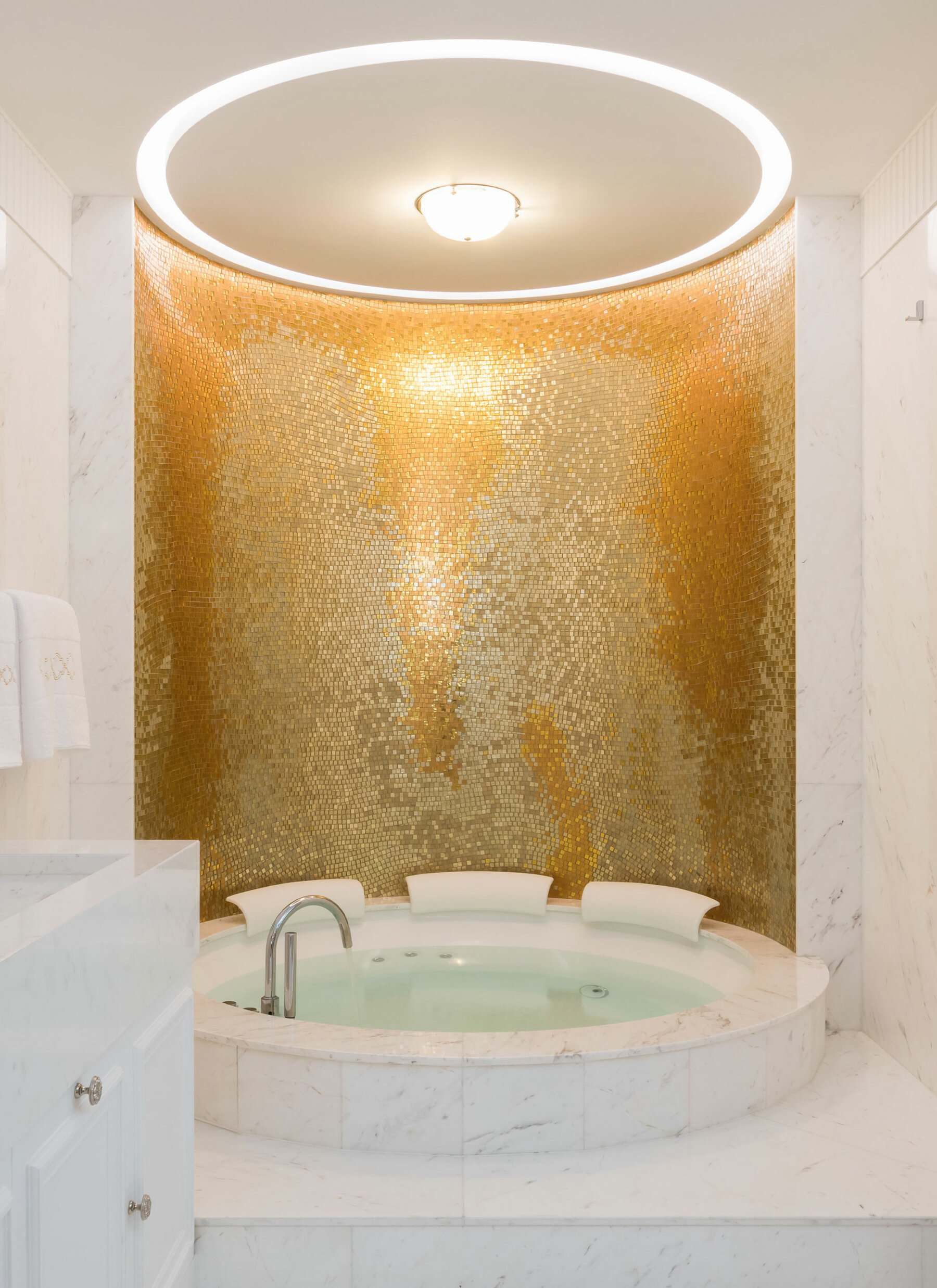 The master apartment, occupying 92 square metres on the first floor and accessible directly by lift, comprises a boudoir inspired by the Turkish boudoir of Marie-Antoinette from the Château de Fontainebleau—ideal for relaxation—a bedroom with a tailor-made bed for enhanced comfort, an exquisite bathroom featuring a freestanding bath and showers in Carrara marble and golden mosaic, and a walk-in dressing room.