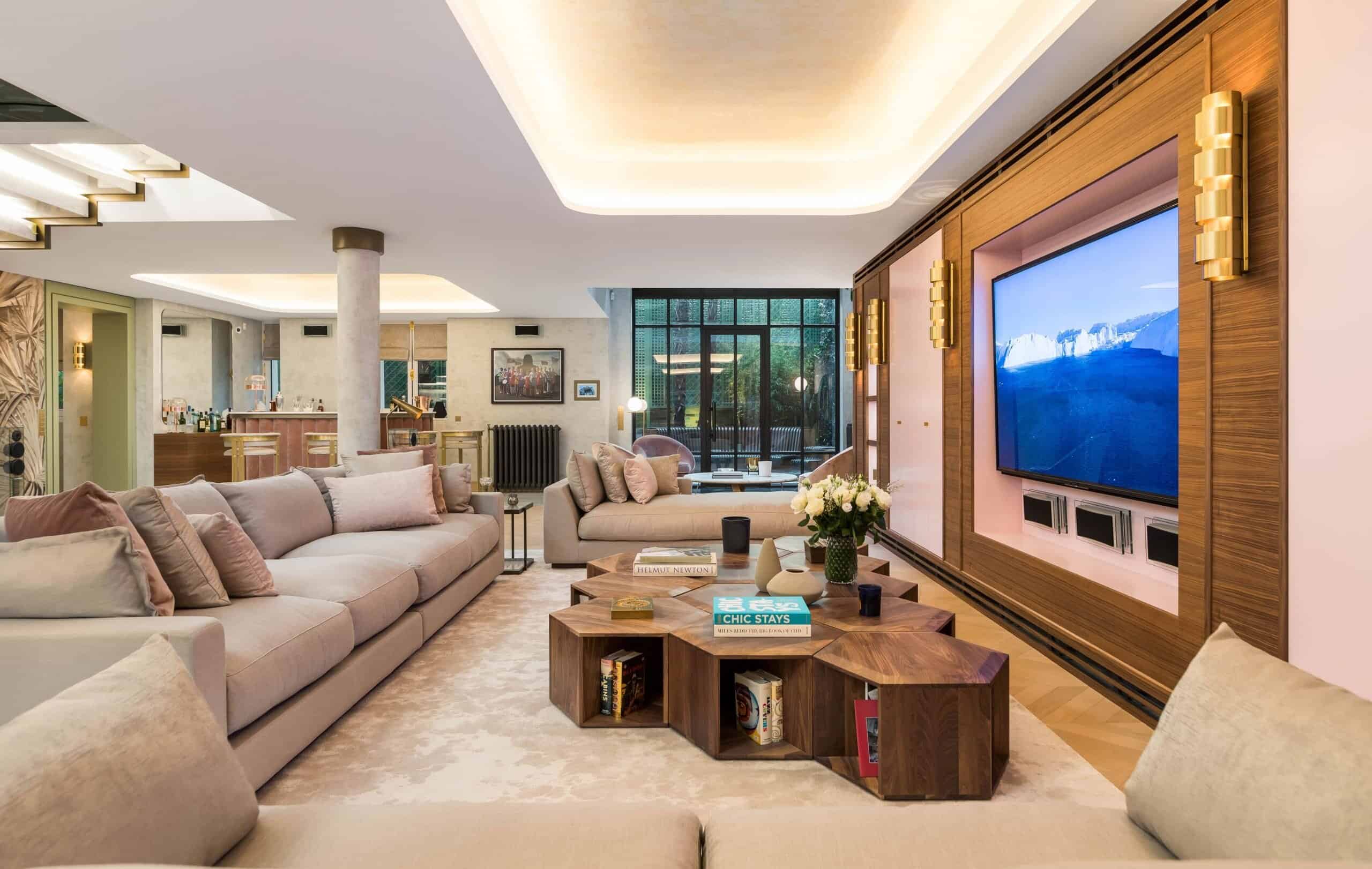 In the kitchen, avant-garde and one-of-a-kind works of art have been integrated, with the La Cornue cooker standing as a masterpiece in itself. Every detail of this kitchen is designed to combine excellence with refinement, featuring a carefully crafted palette of stone that complements the bold, fresh cabinets. This space serves as both a functional cooking area and a work of art, embodying the mansion’s commitment to luxury and design excellence.