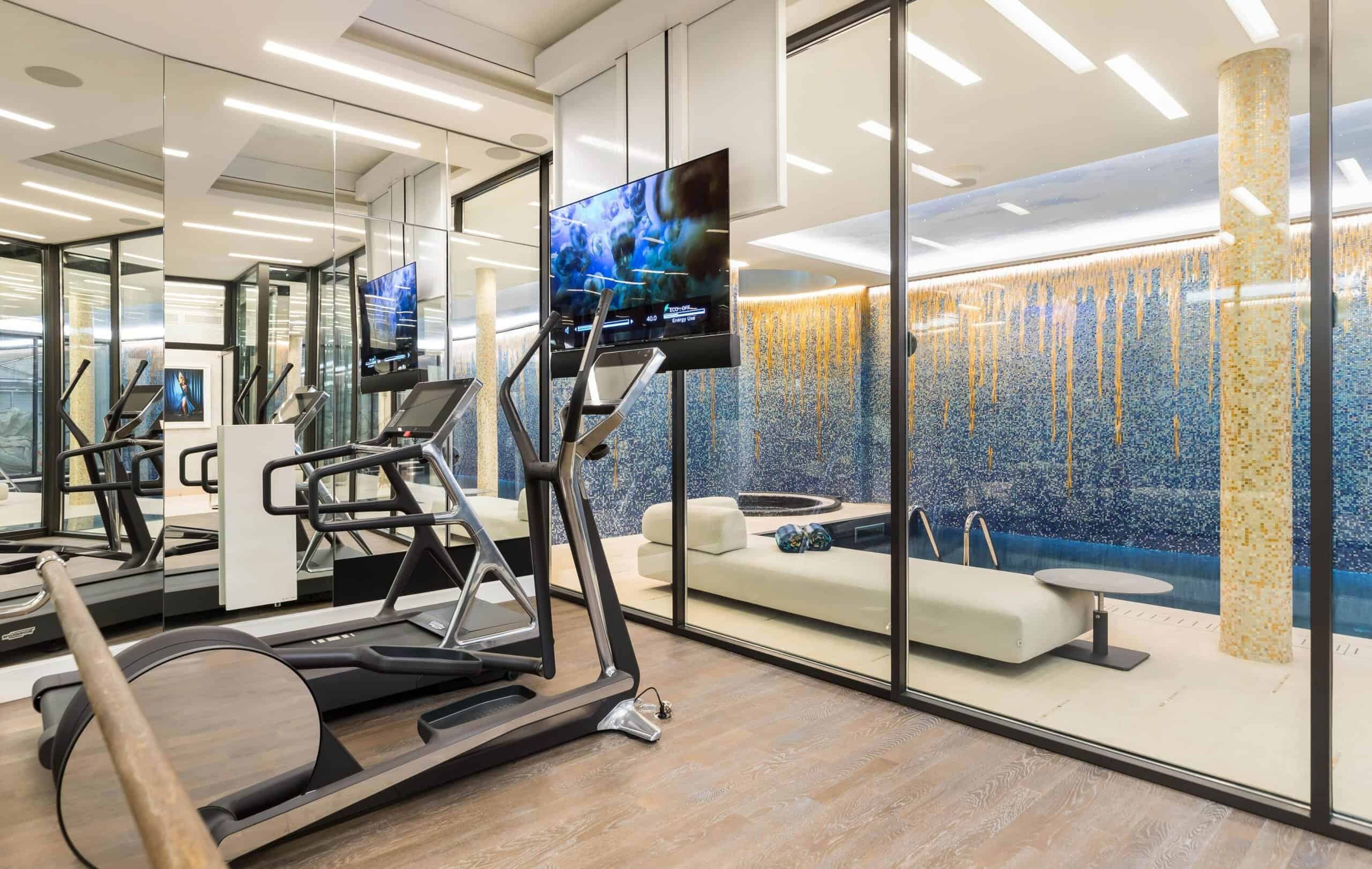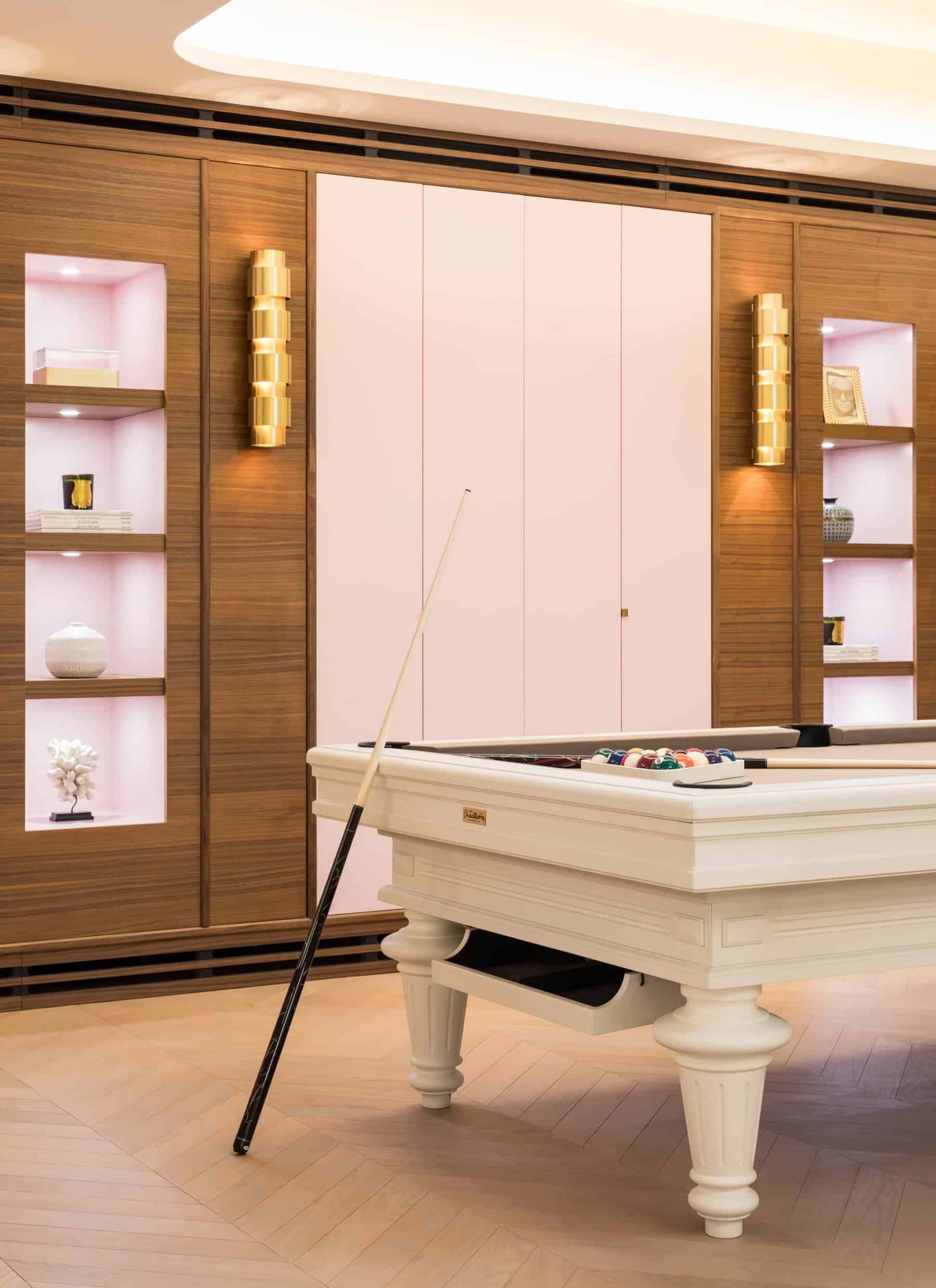 The family room, spanning 147 square metres, is accessed via a Carrara marble staircase. This warm and sophisticated space features a full-sized billiard table, cosy banquette seating, and a refined atmosphere, offering residents an opportunity to unwind, spend time with friends and family, or simply hone their playing skills, all within a laid-back, elegant, and beautifully appointed environment.