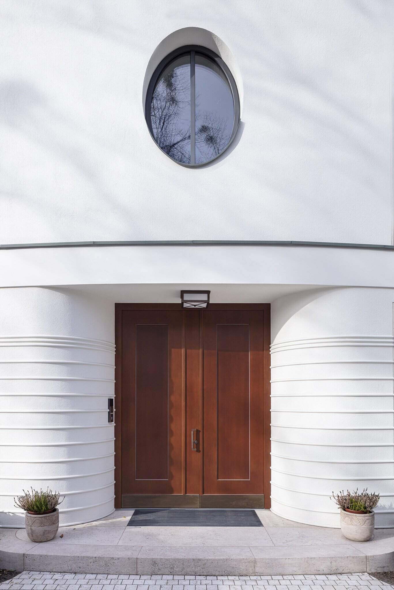 The villa’s symmetrical facades are thoughtfully designed, with a central main entrance that serves as the focal point. Single-story projections intentionally disrupt the symmetry, adding depth and visual interest to the structure. The distinctive rounded corners are a key feature of the external appearance, contributing to the building’s unique character. The curved entrance facade mirrors the street’s layout, establishing a seamless connection between the villa and its urban context.