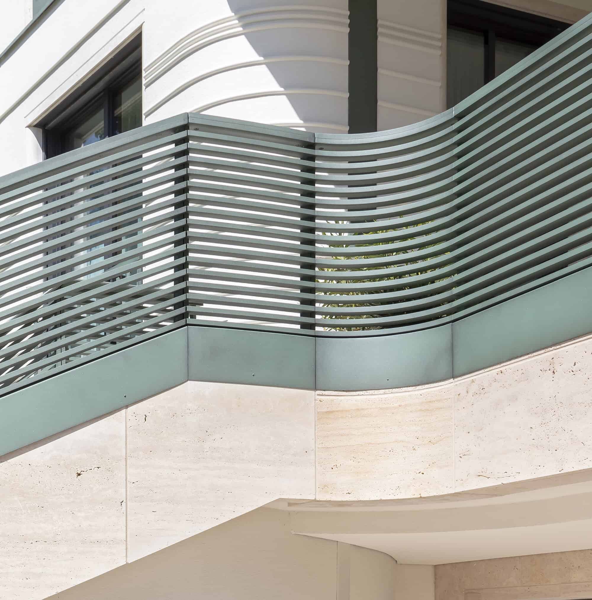 Metal elements, powder-coated in a special shade of green, provide both a subdued and distinctive color accent within an otherwise limited palette of materials-appropriate tones. This subtle use of color enhances the villa’s aesthetic appeal without overwhelming its classical proportions. The careful selection of materials and finishes reflects the architects’ attention to detail and their understanding of the building’s context.