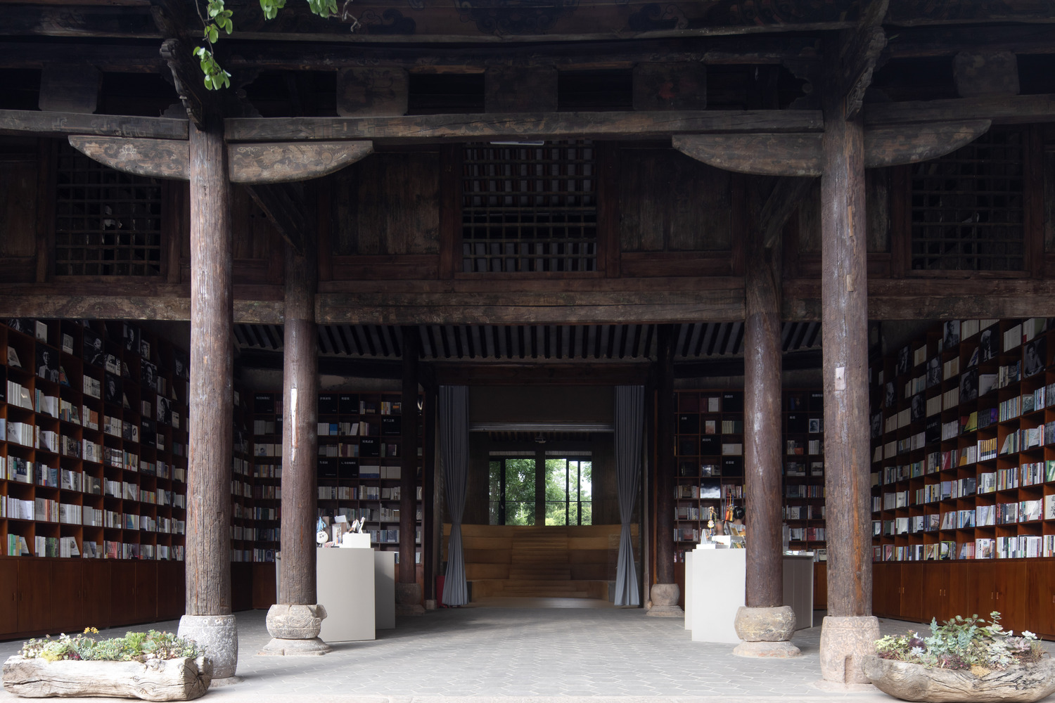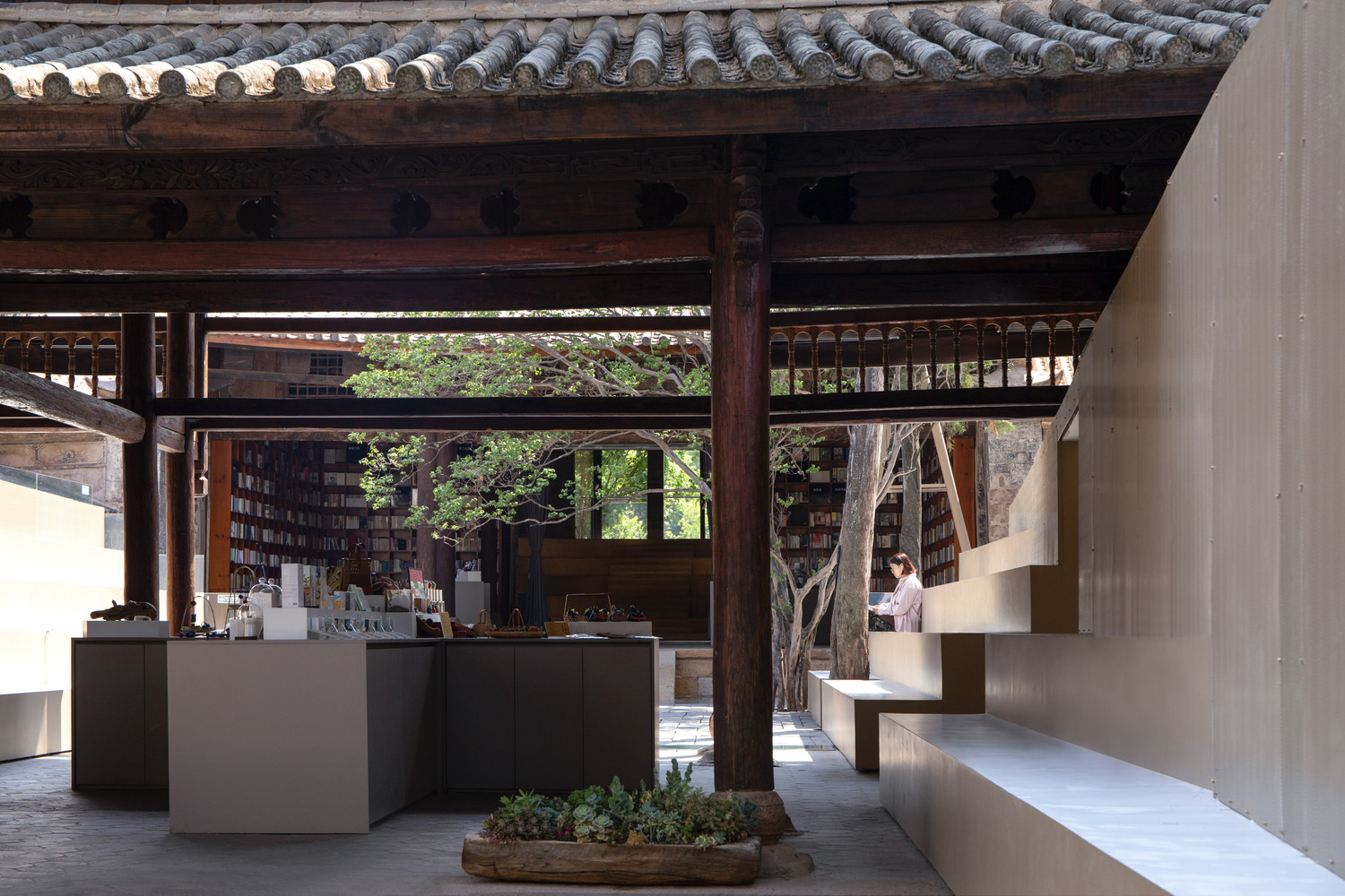 TAO’s design philosophy for the Weishan Chongzheng Academy Bookstore of Librairie Avant-Garde focused on minimal intervention to preserve the site’s historical essence. The project meticulously maintained the original spatial atmosphere and existing trees in the courtyard, ensuring that the historical walls and wooden structural details were preserved to the greatest extent possible. This approach demonstrates a profound respect for the local history and the natural landscape, allowing the academy to retain its cultural significance while embracing contemporary functions.