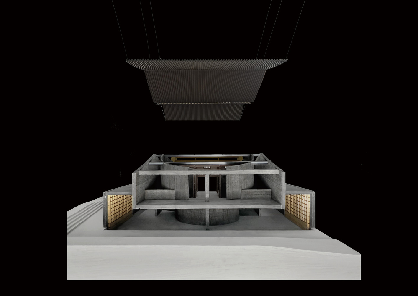 The design employs a ‘pavilion within a pavilion’ concept, with an inner pavilion for the theater and an external pavilion with a traditional herringbone pitched roof. This dual form creates unique in-between spaces and enriches the visual relationship and spatial tension inside the building. The floating gabled roof, supported by wood-grained concrete walls and steel beams, harmonizes with the architectural style of the historic building.