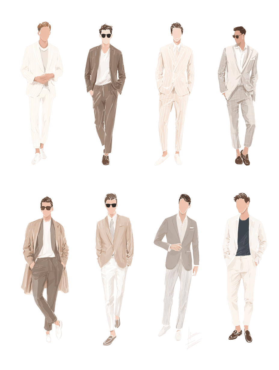 A simple way to use this cutout of Fashionable Illustrated Men is to place it at “decision points” in your layout—entries, circulation pinch points, lobby thresholds, or moments where program changes. These are the areas viewers naturally use to judge scale and intent. If you’re making a collage or concept board, anchor this cutout of Fashionable Illustrated Men against a strong vertical or a floor datum first, then adjust the surrounding tone/contrast to keep the cutout integrated (not “floating”).